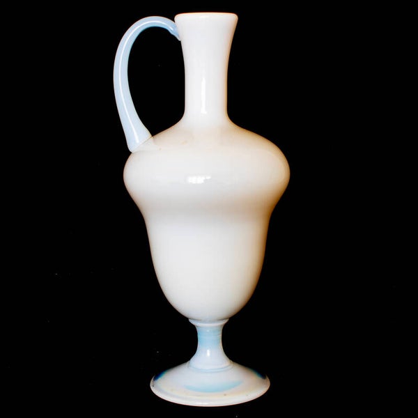 The body of this ewer type jug is made from opalescent glass while the base and handle are opaline glass. The shape has good symmetry and a certain elegant balance, as should be expected from the world renowned Sevres factory. The vase stands 250mm tall with a diameter of 125mm. The design is soliflore - to hold but a single bloom and emphasis the beauty against the background of a vase that doesn't compete for attention.