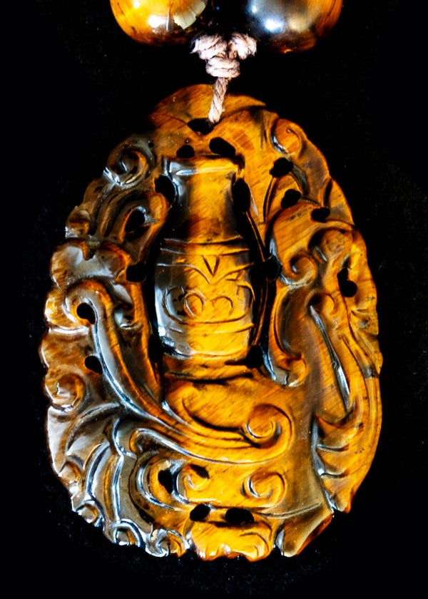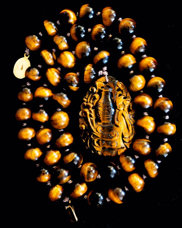 Quality ‘Tiger’s Eye’ necklace with carved pendant & 52 hand knotted spheres