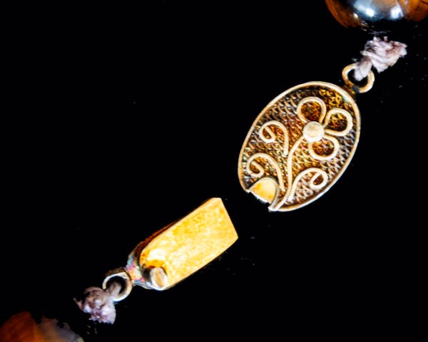 I have always regarded hand knotted necklaces as a sign of quality and pieces such as this necklace serve to confirm that belief. Tiger’s eye is a chenoyant member of the quartz family with the silky lustre being a result of intergrown fibres of amphibole. Ok science lesson over and believe me, my knowledge is all down to Google and AI. The spheres and pendant are beautifully polished and this accentuates the multi-surfaces of the pierced and carved pendant. The clasp, with its own floral decoration, appears to be a gold washed silver and holds well against what is a weighty necklace. The overall length of the necklace is 730mm with the clasp fastened, the 48mm in depth and a maximum of 34mm wide. The spheres average a diameter of 12mm.