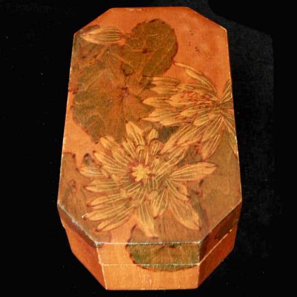 This small octagonal box is constructed of what seems like light wood with a pink paper lining. However, light construction or not, it has none the less survived a huge number of years, and even the decoration, faded, none the less survives. There is little I can say about this box that the photographs don’t show, and since images speak as loud or louder than words, I will ask that you study my images for the maximum of information. The box measures 125mm by71mm by43mm (LxWxD).