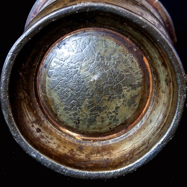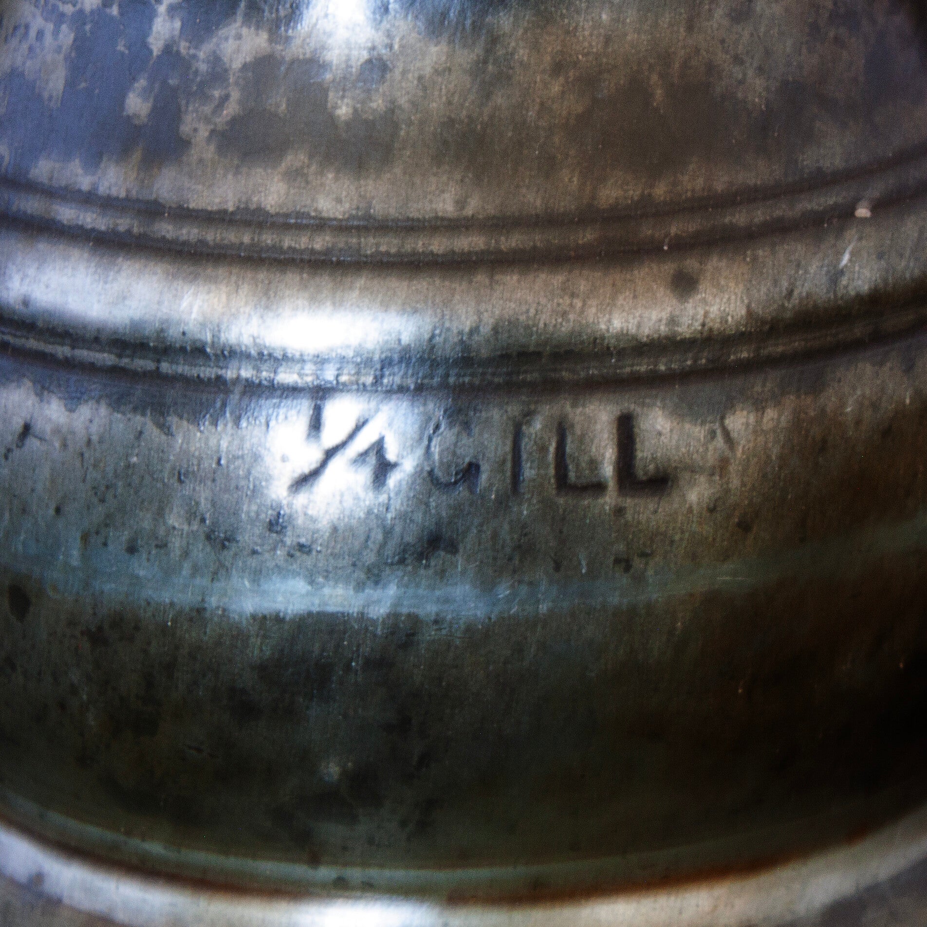 This is a nice example of this type of antique measure, generally used behind the bar to measure spirits. The stamped mark, issued when the measure was tested for accuracy by the appointed Government agency, contains a crown, and what I see as the letters ER for Edward VII Rex and what appears to be the year number of ’09. Edwards’ reign ran from 1901 to 1910 which puts the of '09 toward the end of the Edwardian era. There is also a stamped mark for the measure being ¼ Gill – these would have fallen out of favour when the lead content and its ability to be absorbed by the alcohol in the spirits. This is a pre-owned item, offered in unrestored condition which stands 50mm tall with a base diameter of 42mm. A ¼ gill is the equivalent of 1 ounces of alcohol.