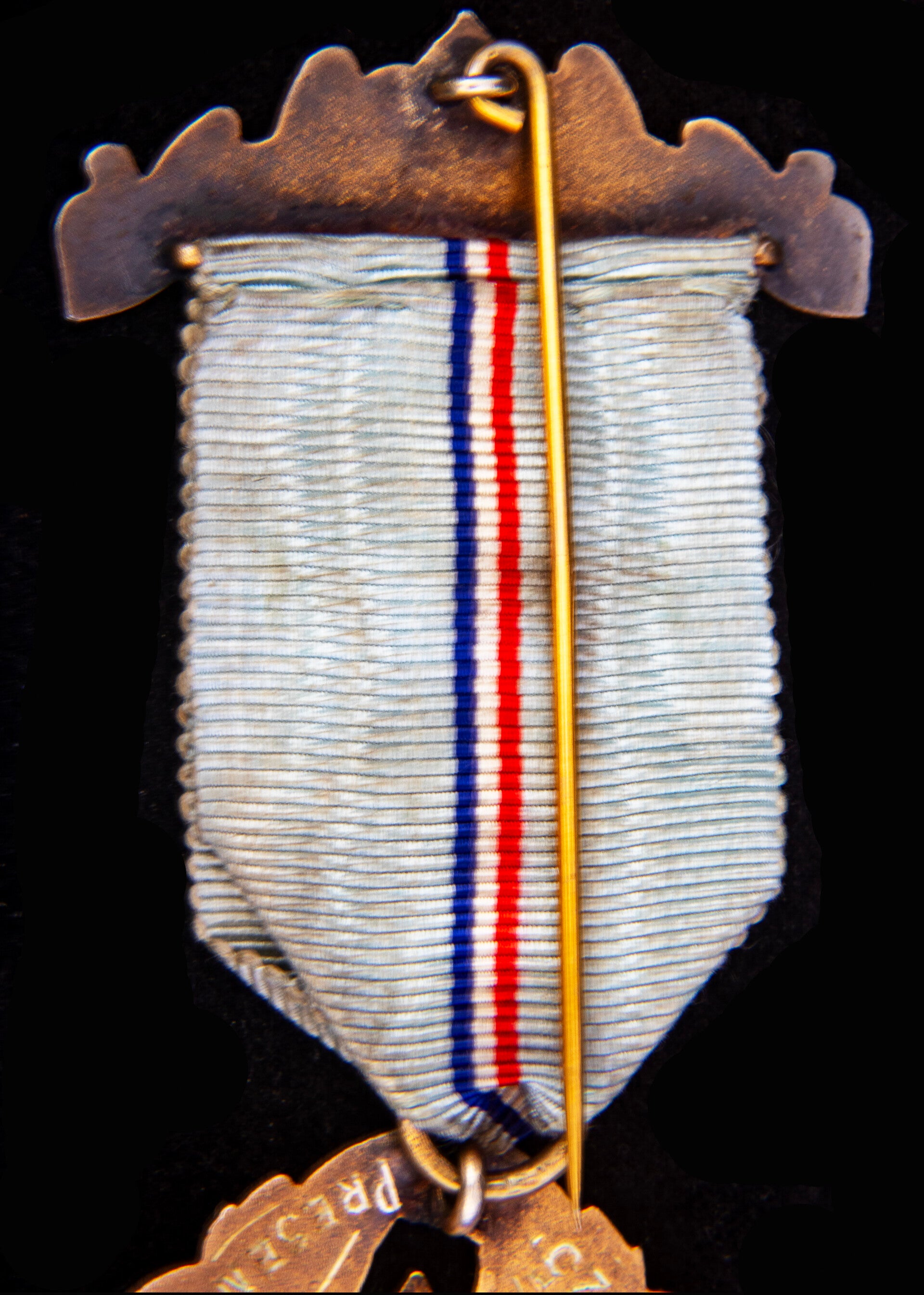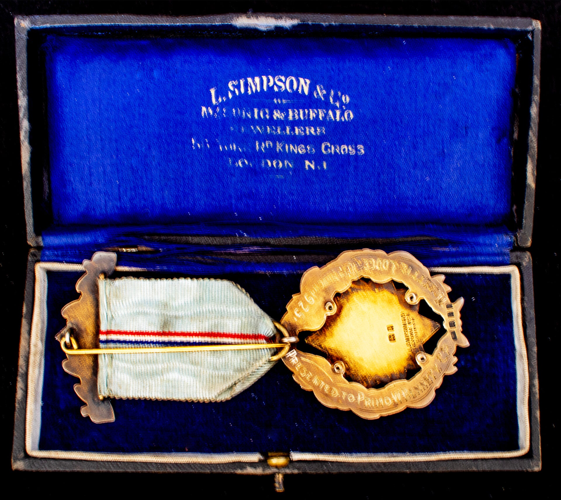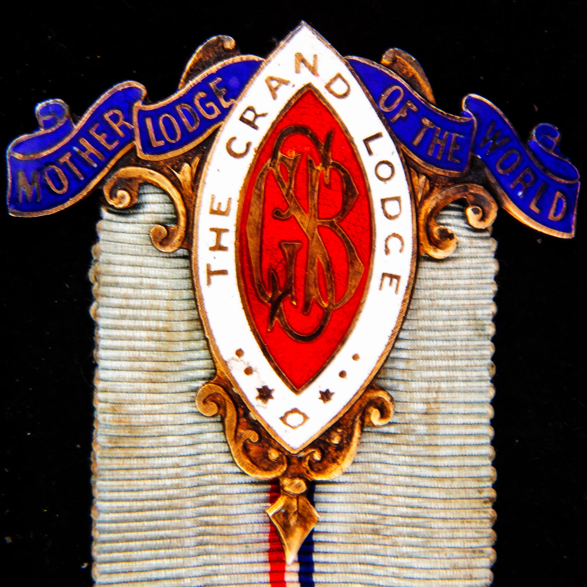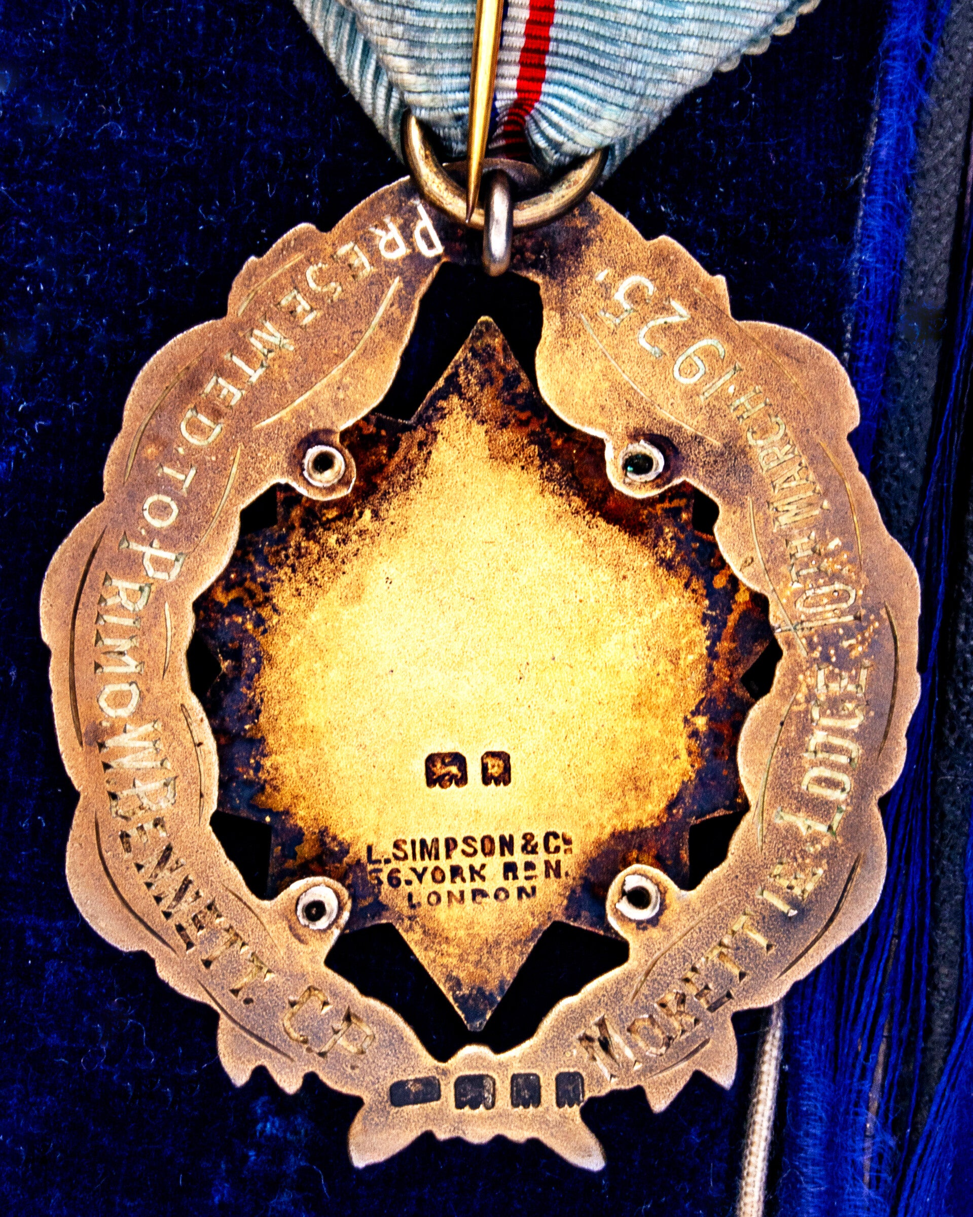 This antique Masonic lodge jewel turned 100 in March of this year and is offered in the maker’s original presentation box. Dating of the jewel was identified by the sterling silver hallmarks from a London assay of 1924 and the jewel presentation date of 10th March 1925. The “primo” jewel is associated with the “United Grand Lodge of England”, identified by the top bar stating “Mother Lodge of the World”. The United Grand Lodge of England (UGLE) is regarded as the foundational entity from which other Grand Lodges around the world are based. The entwined gold letters in the red oval (GSB) I believe to stand for the Grand Surrey Banner and lean toward this jewel being one from lodge of “The Royal Antediluvian Order of Buffaloes”. On the circular, lower part of the jewel, the Latin reads “Nemo Mortalium Omnibus Horis Sapit and this is the motto of Buffaloes orders, translating to “No mortal is at all times wise” on the reverse the jewel border indicates the recipient of the Jewel and the membership of Marettie Lodge – I could not locate the lodge either locally or in Great Britain. The enamel work is still bright and free of damage, in fact the only flaw I can see is the silk lining of the inside boox lid has deteriorated at the hinge area between top and bottom part of the box. The jewel weighs 30.8gms by my scales.