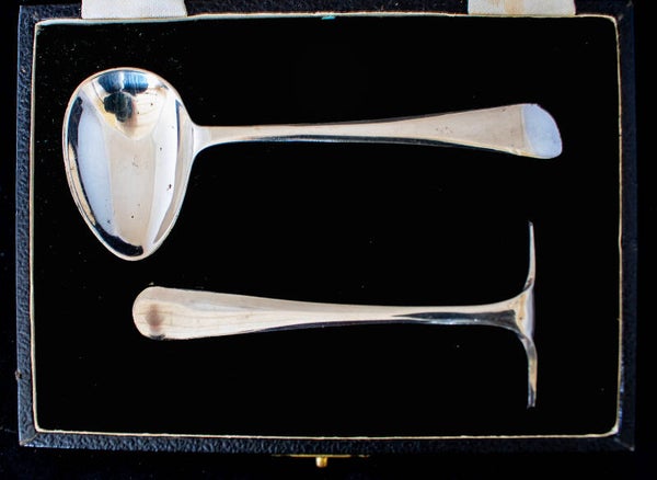 Popular EPNS mid-century christening gift, boxed spoon and food pusher