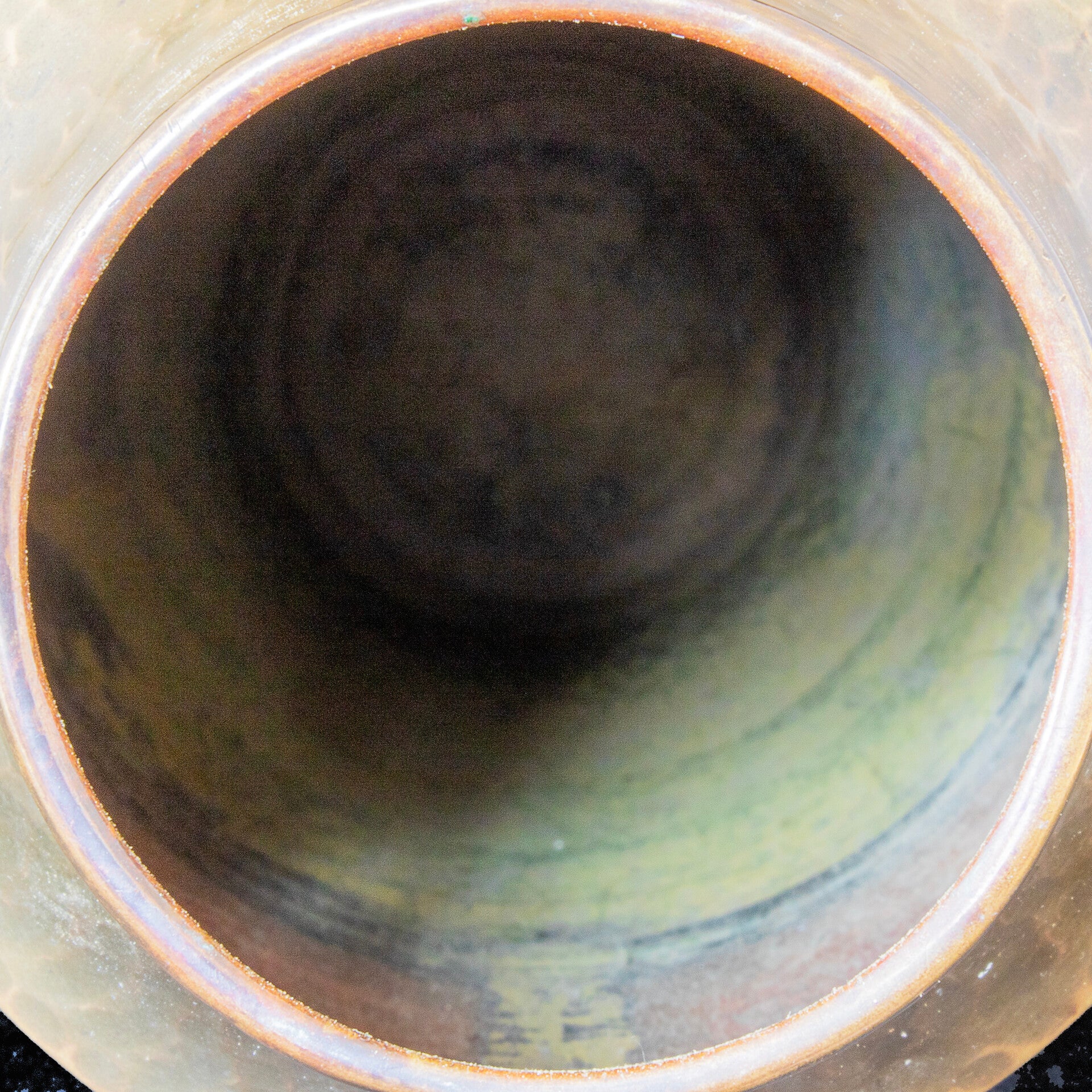 Even for the art nouveau period, this vase is a stand out. With a panel of fine relief frieze and enamel painting, this is an example of Wurttemburgishe Metalwarenfabrik (WMF) at their finest. With the tall brass body almost divided into four discrete sections – the head. The decorative enamelled panel, atop the slender body, all supported by a stabilising foot, the vase is an uncommon design and difficult to find. The underside shows the WMF ostrich and rhombus beehive mark, which was introduced in 1909. Height 308mm tall with a base diameter of 95mm! In superb pre-owned but remarkably well cared for condition.