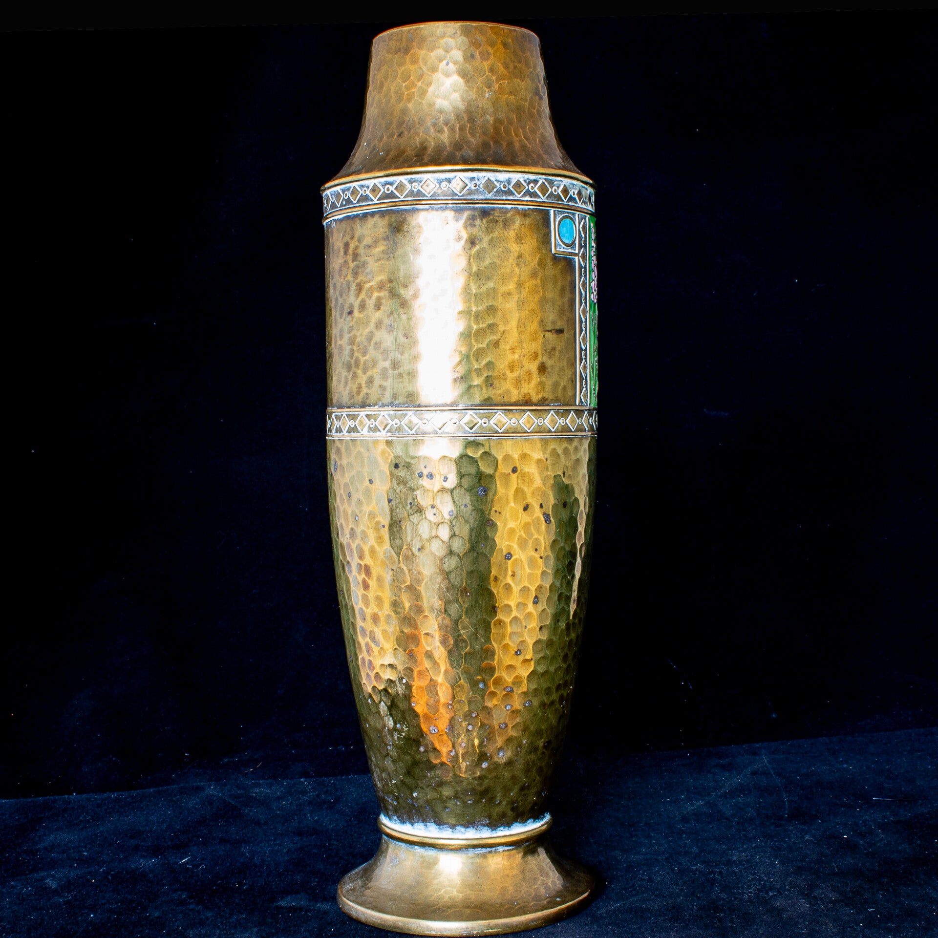 Art Nouveau era WMF brass vase with panel of enamel decoration