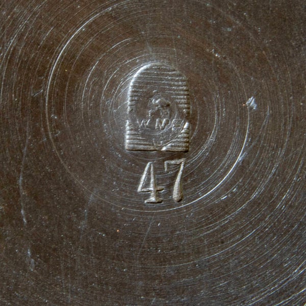 Auld Curiosities is delighted to offer this brass vase decorated in a restrained art nouveau style. Made by the renowned WMF (Wurttembergische Metallwarenfabrik) of Germany, the vase appears to be solid brass – with small enamel highlighted flowers in the presence of slightly smaller flowers that aren’t enamelled. The design has a pleasing flow and clean lines and probably sits toward the end of the art nouveau era, going into the art deco. The back-stamp features the iconic running ostrich in a rhombus which is further contained by a domed rectangular frame with horizontal lines. This mark was introduced in the first few years of the 20th century and was used up until the early 1930’s. The vase stands 13 ¾”” (370mm) tall and has a rim diameter of 3” (76mm) and a maximum body diameter of approximately 4 7/8” (124mm). This is a pre-owned items and it does show some wear and one small dent which does show in one of the photographs.