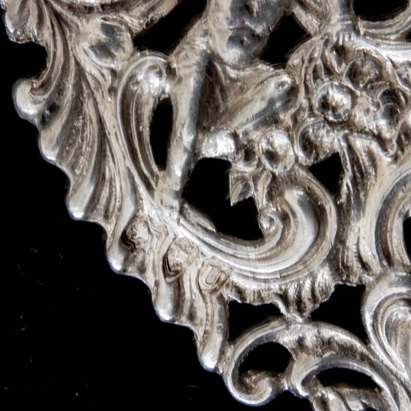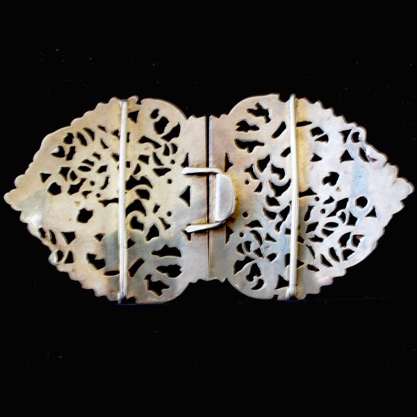 For your consideration we offer a sterling silver belt buckle, with hall marks for London, 1895 and the maker’s cypher for William Comyns and Sons. The buckle is ornately covered in vines, leaves and flowers with three cherubs on each half of the buckle. The back of the buckle, as shown in the fourth photograph, has a bar on each half for the belt material to loop through and be sewn flat, as well as the hook and eye type clasp for closing the belt. The belt weighs a very solid 83grams and measures 130mm at the widest part of the horizontal and 72mm in depth at the widest part.
