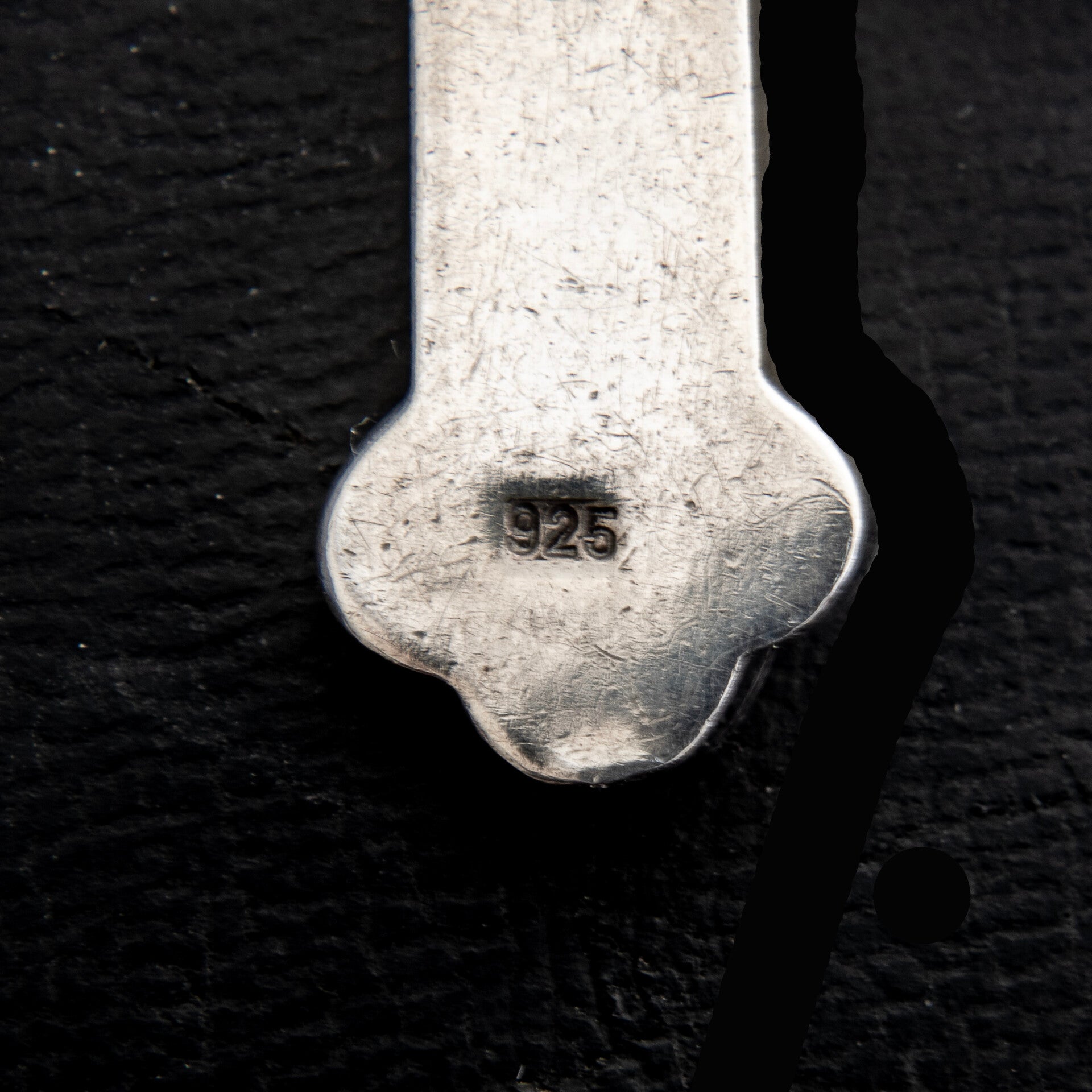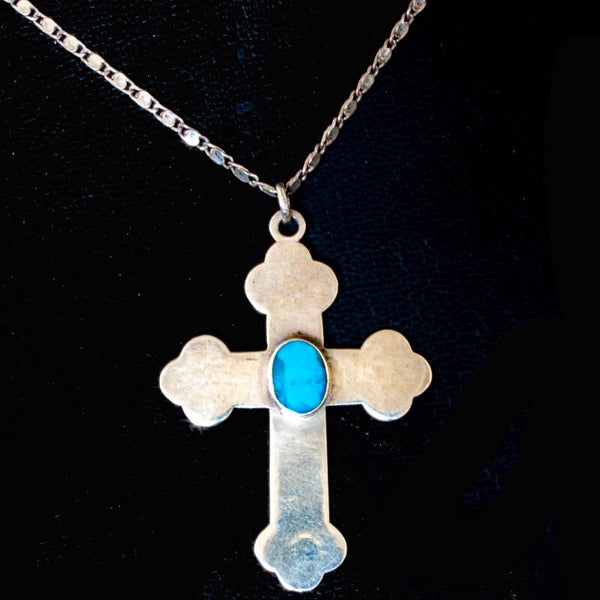 Sterling Silver cross with a blue stone mounted on the cross point. There appears to be a wide range of cross designs and names. This style of cross appears to be a slight variation on the “cross botonnee” but itralso has striking similarity to the “orthodox” and “grace” crosses, depending on what reference you look to. None of these crosses are shown with a stone mounted on the cross point of the two arms, but I have to admit it does lend additional point of interest. The stone has the appearance of turquoise in terms of colour and thin darker blue inclusions but I am not a gem expert, so selling this cross as having a coloured stone centre rather than a precious or semi-precious stone. The cross and the chain are marked as 925 for sterling silver and the chain measures 594mm in length.