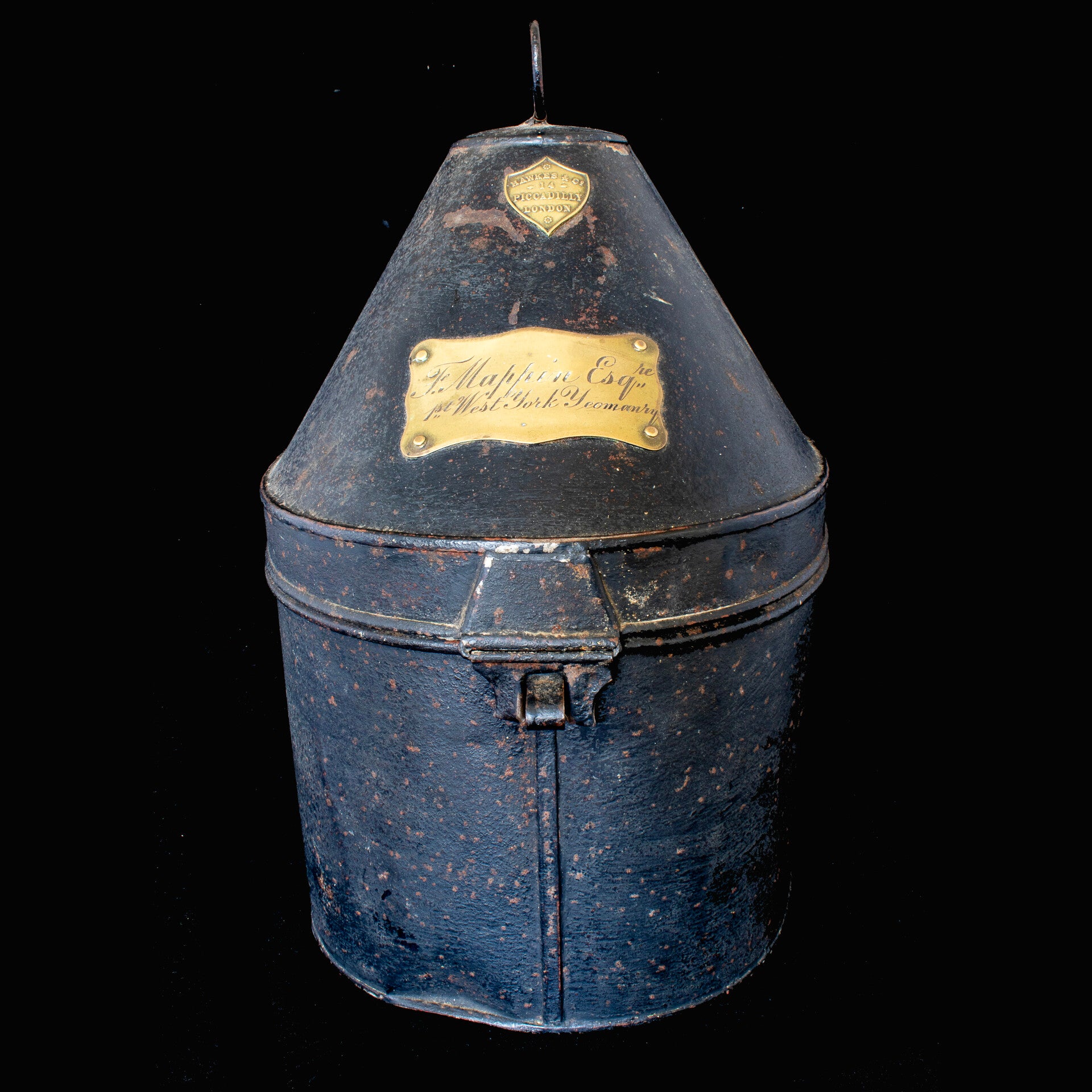 This carrier has a fascinating history dating back to the Victorian era. The F Mappin indicated on the brass name plate is Frank Mappin, son of Frederick Mappin, a master cutler of considerable repute who also was a well-known local government figure, businessman and philanthropist in the Sheffield area He was knighted and awarded the title Baronet of Thornbury which passed to Frank in 1846 as the 2nd Baronet. Frank Mappin served in the 1st West Yorkshire Yeomanry, reaching the rank of captain and then honorary Major. On Frank’s death in 1920 the title of Baronet passed through other male family members until it reached Frank Crossly Jr who was the 6th Baronet of Thornbury until his death in 1975. At some point this helmet carrier by Hawkes and Co., military tailors and outfitters Made its way to New Zealand, probably via Frank Crossly Mappin who had moved here in 1908 and was a renowned orchardist, horticulturalist and philanthropist. So, history aside – the helmet carrier is sans helmet unfortunately, metal construction with a Jappaned finish which is showing its age. The coating has worn through in places and superficial rust discolouration can be seen inside and out. Auld Curiosities has not initiated any repair to this, or the broken locking flange, so the buyer can decide what they feel appropriate (see images). The carrier stands approx. 335mm tall (with the handle upright) on a base which measures 295mm by 207mm. This is baronacy #j