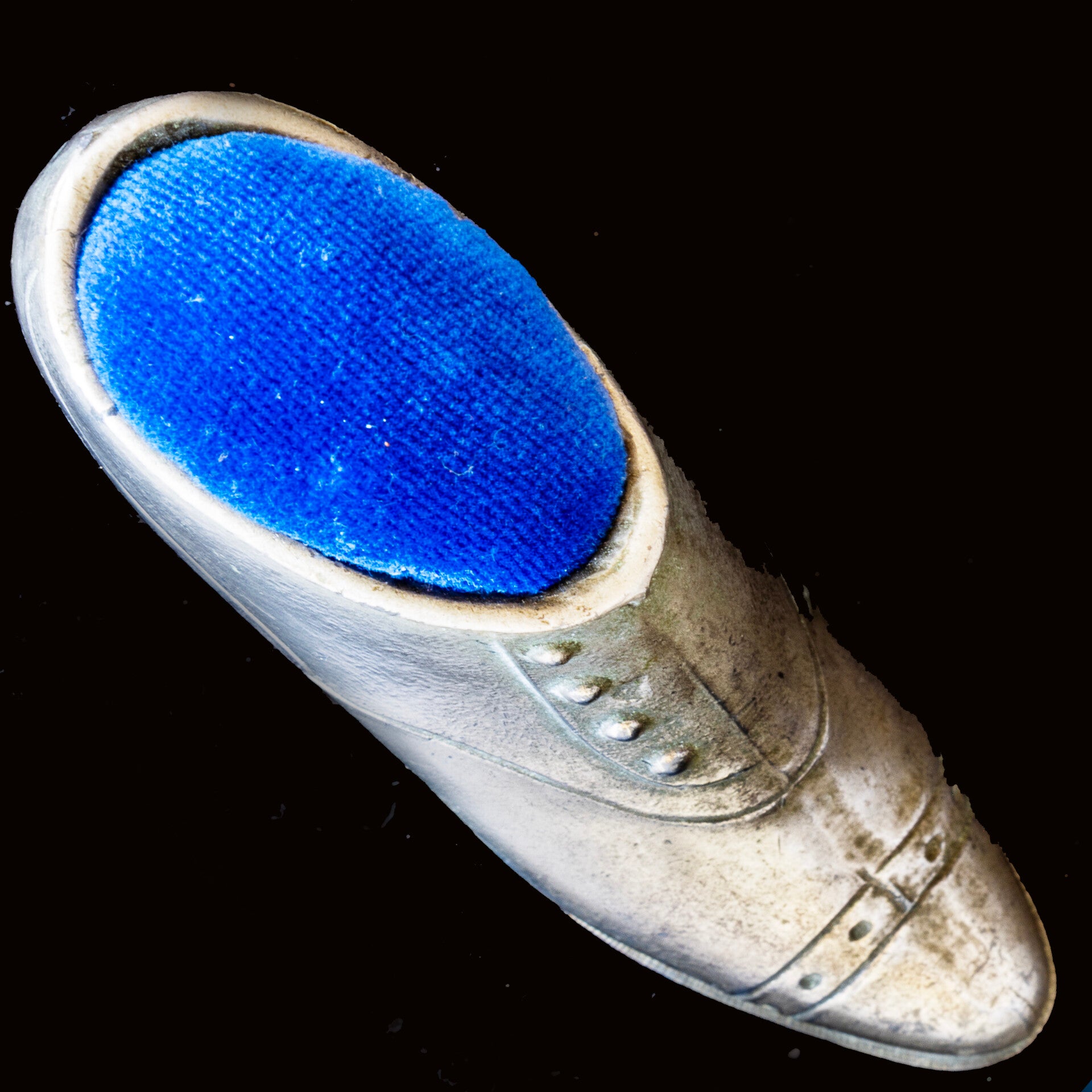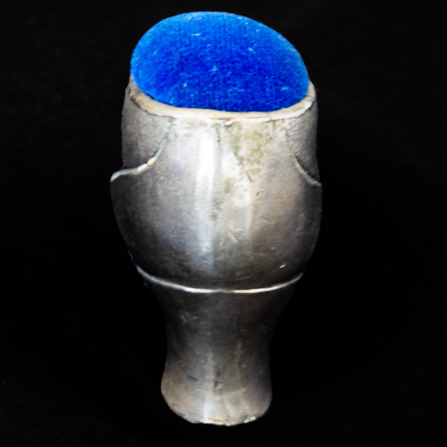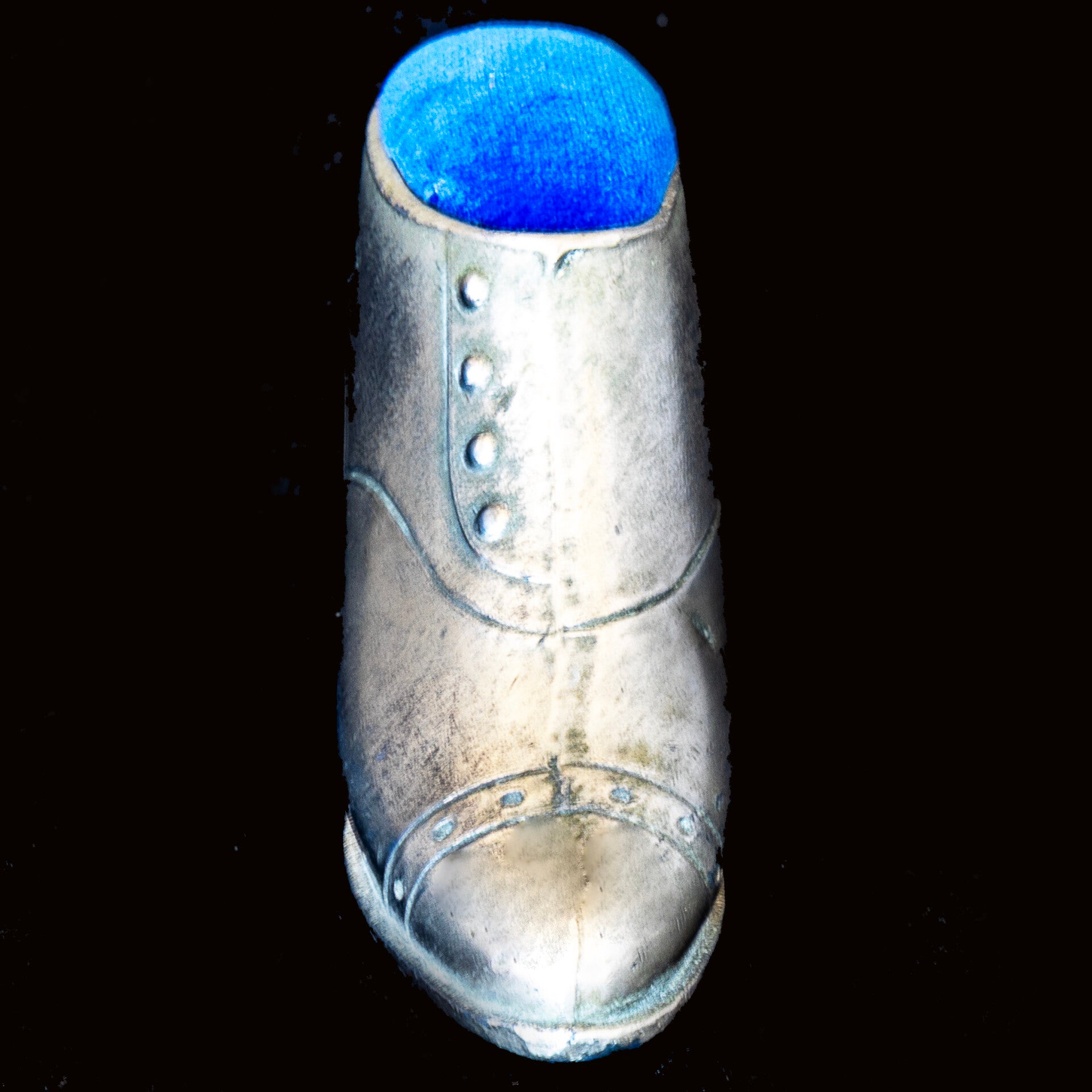 An attractive white metal ‘shoe’ with a velvet pin cushion above the four button vamp. While this style of shoe dates back to the 1850’s – 1920’s and I don’t think we can assume the pin cushion is of equal age. However, I believe the metal to be pewter, which has had a polished silver coating, now worn away in quite a few places, so perhaps early 20th century. The ‘shoe’ measures 102mm in length and stands a maximum of 58mm tall. As photographs form an important part of the description, happy to provide additional images if requested.