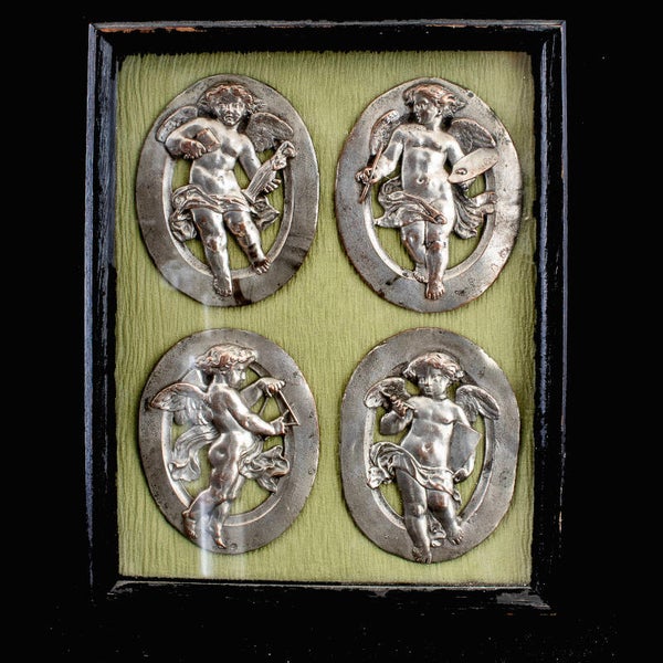4 Antique, silver-plated, copper cherubs as the 4 muses of the arts