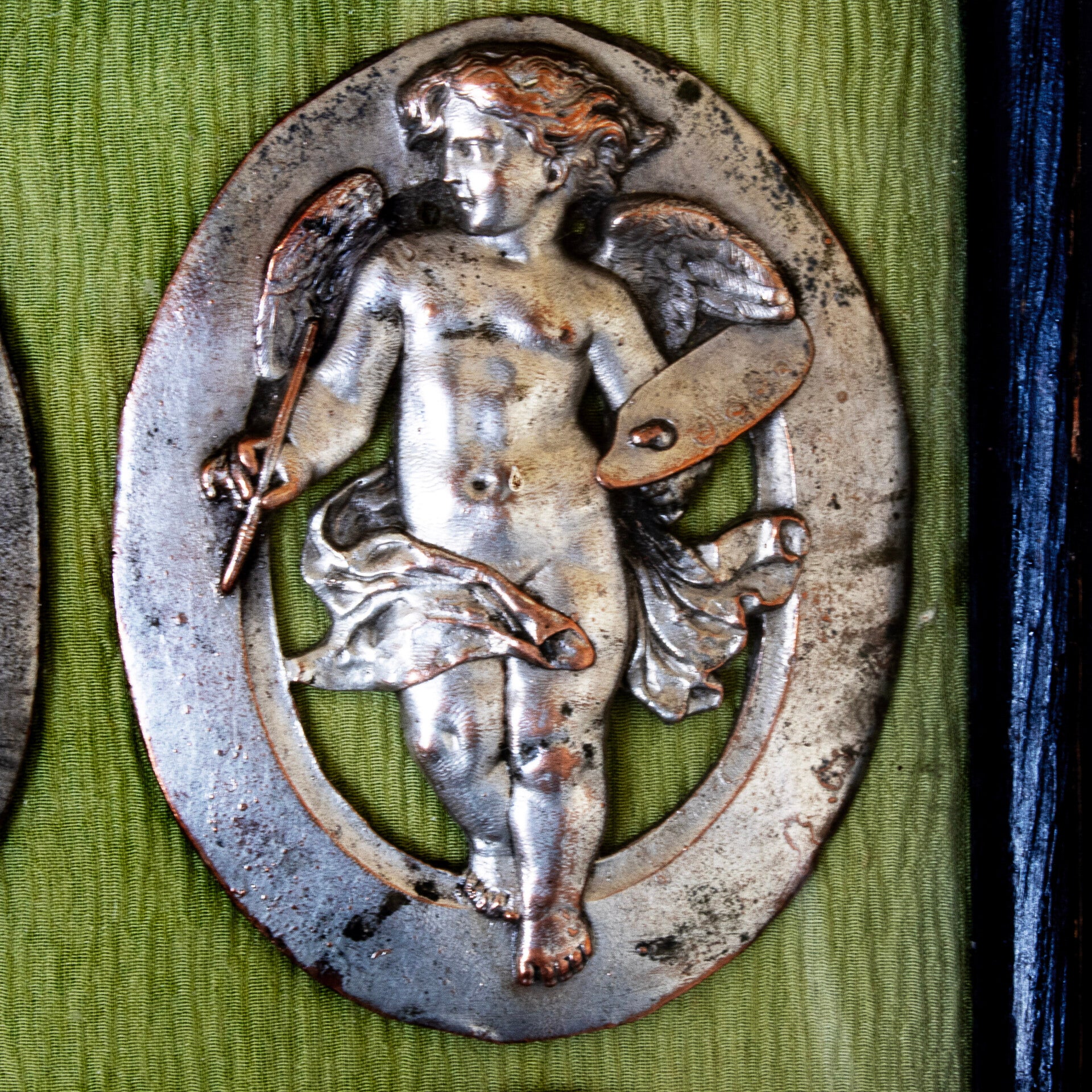 I fell in love with this framed representation of the muses – from top left; the sculptor, the artist, the musician and lastly, the writer in the bottom right. There were 9 muses all daughters Zeus and Mnemosyne, or inspirational goddesses, in Greek mythology and each had an area of oversight. Euterpe the muse of music, Clio was the muse for history and is portrayed with pen and parchment. As far as I can find, there was never specific muses for sculpture or painting – both of which were regarded as being under the auspicious of Apollo. I certainly find the mounting into the frame to be a bit sub-par and if I was keeping this set, I would be looking to redo it into an oblong horizontal frame so that there would be better flow. Plus, the muses could do with a clean, even though the copper is coming through, that is just part of their journey over the decades. We have not been able to find much information on these and without suggesting these are unique, we did do a pretty deep dive into reference material. Representing cherubs as the muses is different, in as much as something I haven’t seen before, but here it certainly works.