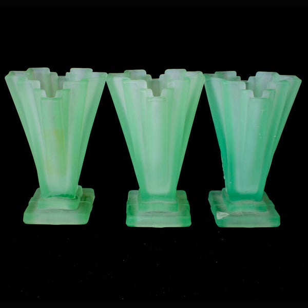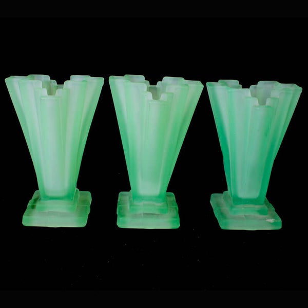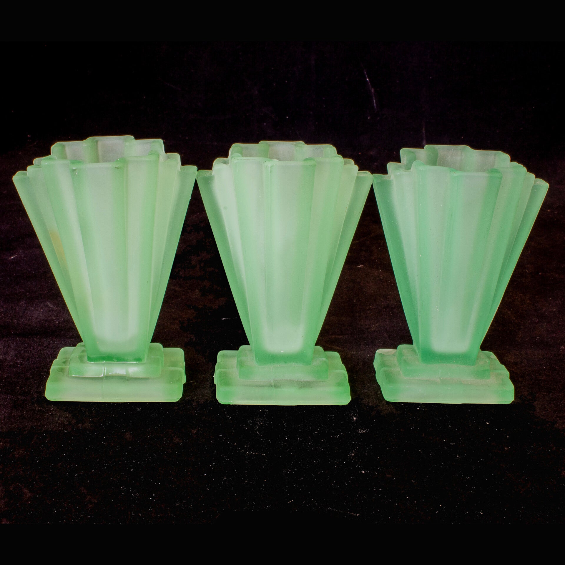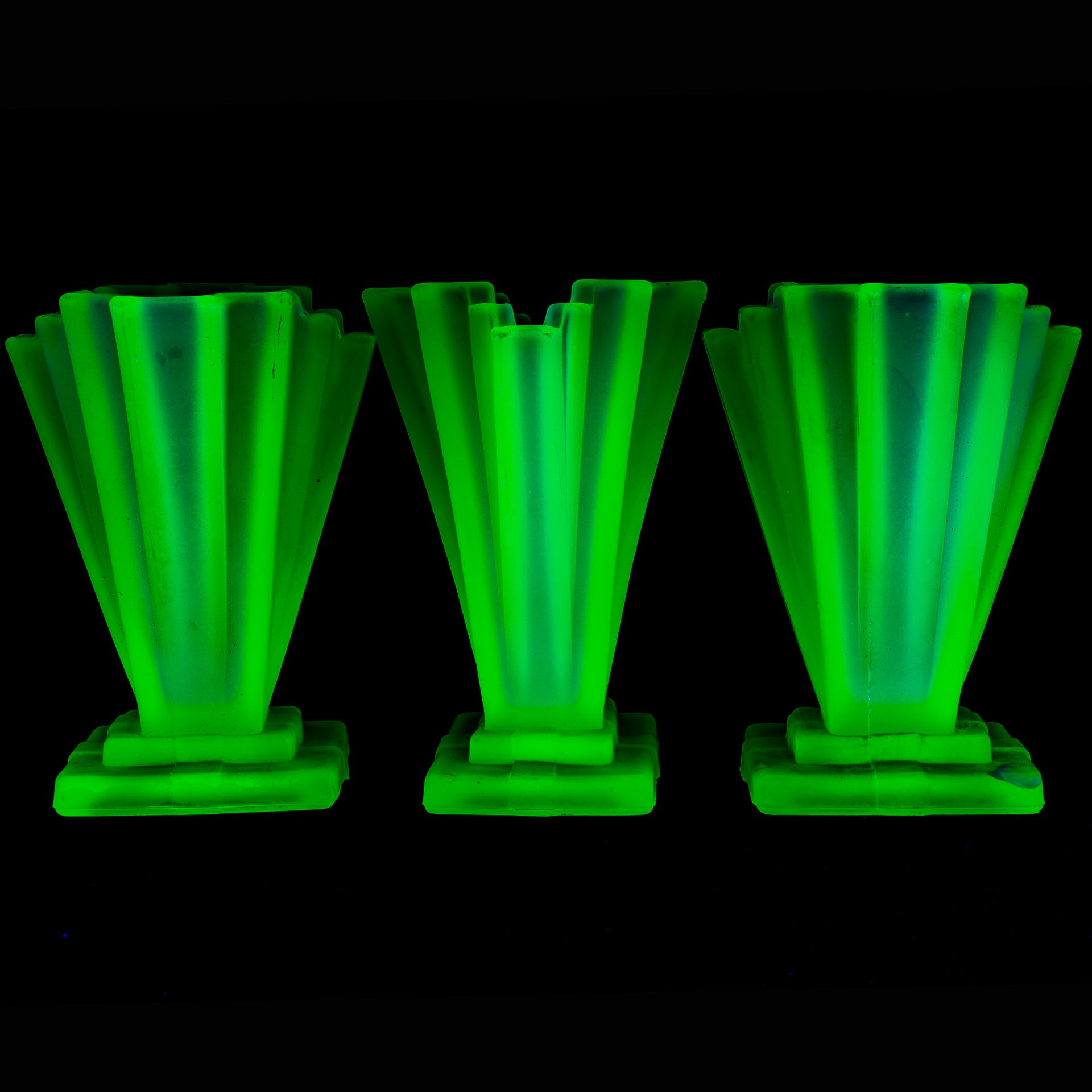 Art Deco era uranium glass trio of Grantham (pattern 334) vases by Bagley