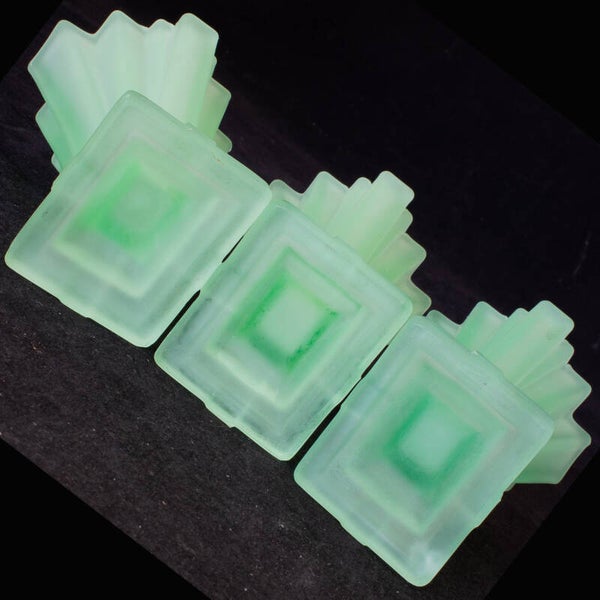 #threevases #uranium glass #granthampattern #satinglass #ultravioletlight #bagleyandco #artdeco #knottingly #westyorkshire #erngland #auldcuriosities #dunedin #otago #newzealand #uvreactive #ornamentalglassware