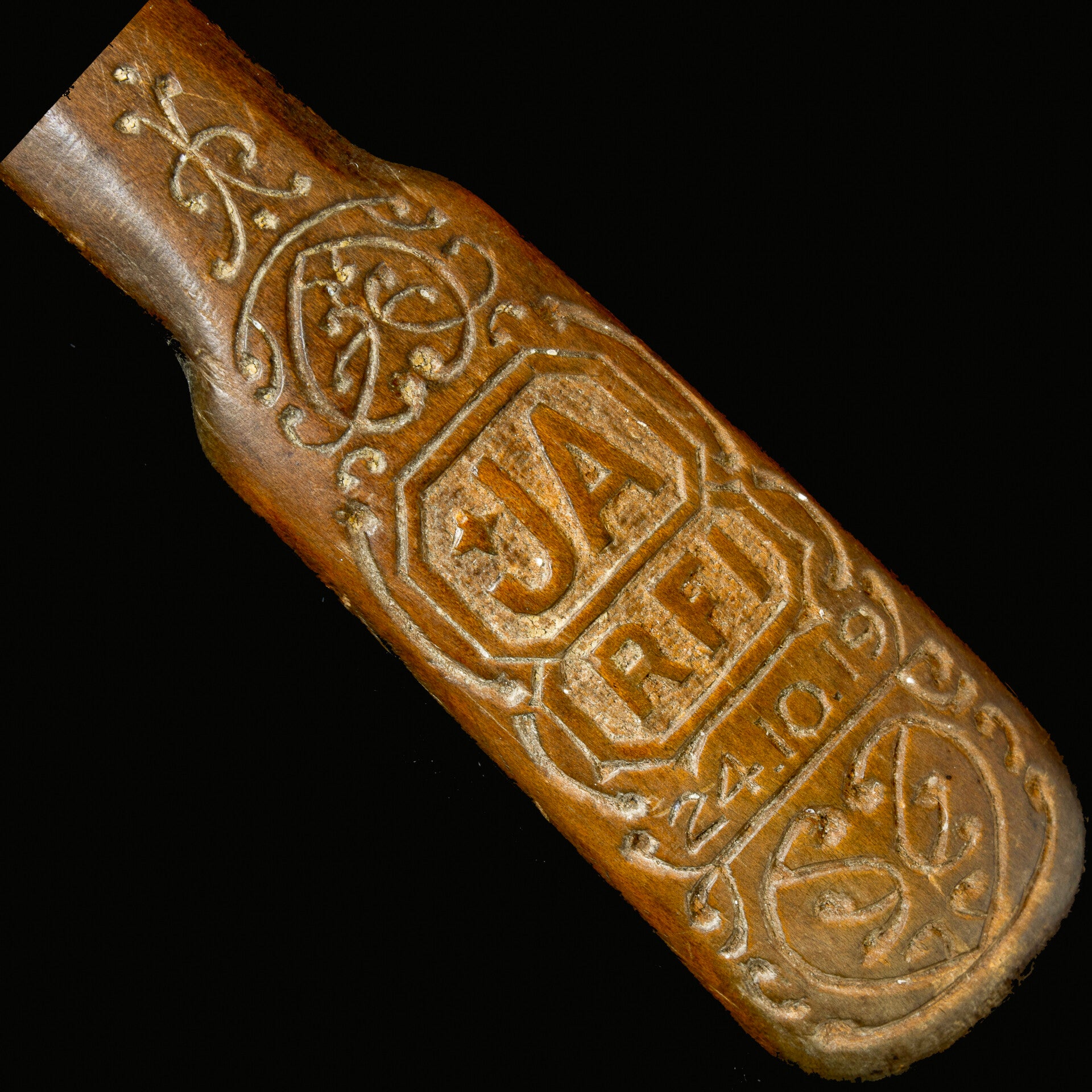 Antique, hand carved and decorated wooden spoon, dated for 24th October 1919. The spoon is a truly unique curiosity, carved from what appears to be a single piece of New Zealand Kauri or Totara and bearing quite intricate decoration – the carver was clearly a craftsman of significant talent. The bowl of the spoon shows wear commensurate with age and use, fading to the timber colour, due perhaps to being exposed to, and frequently immersed in liquids. Potential buyers should note that there is a hairline crack running from the centre of the leading edge of the bowl progressing toward the shaft of the spoon. This fine crack runs for about a centimetre on the inner surface of the bowl and perhaps half as much again on the bottom side. The terminal of the shaft is both darker in colour and showing less impact from use. This has enabled the carving to remain crisp and sharp on both front and rear surfaces. The two cartouches with initials are taken to indicate at least one person and either a second person or some special significance to that person. Research has failed to come up with a definitive indication of what RFI may indicate (options range through ‘request for information – unlikely, and Radio France Internationale – also unlikely).so it seems reasonable to lean toward these being the initials of a second person. Perhaps the spoon marks an engagement, marriage or similar, it in likely that we will never know. We do know that there is strong ties to New Zealand with some of the filigree-like carving being of Maori designs and of course the full ‘Tiki’ on the rear surface. The spoon measures 10” (254mm) in length.