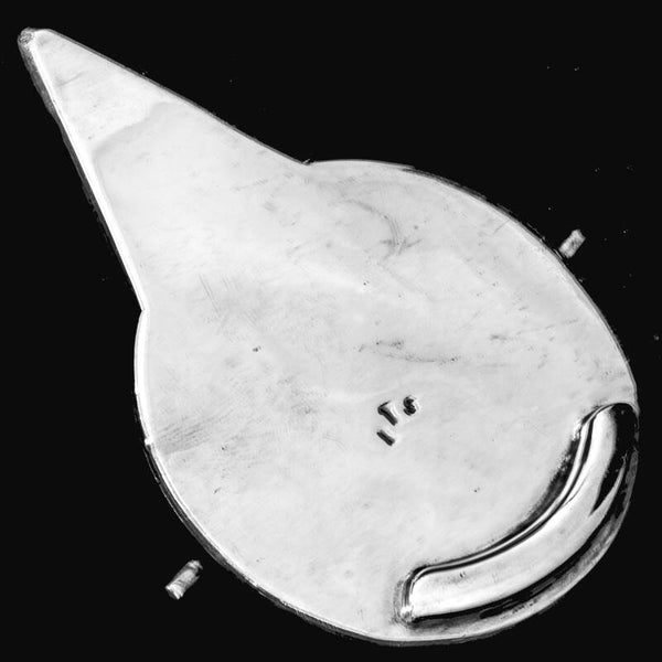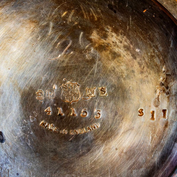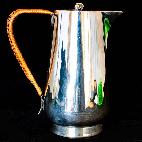 Very clean lines to this EPNS coated hot water jug with good clear backstamp on the base. The handle is covered in a quite intricately patterned raffia, offering the hand a good grip and some protection against the heat transfer from water to metal. The backstamp was used, in this form, between 1914 and 1926 only so there is a clear indicator that this jug was made within those 12 years, when the company was respected for their jewellery and fine metal production, retailing from Regent Street and Hatton Gardens in London. This is a pre-owned item so there is signs of use but nothing that really detracts from the over all impact of the piece.