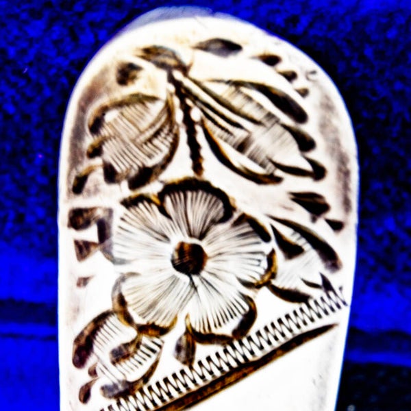 Antique, cased sterling silver spoon 1907 assay for Levesley Brothers Auld Curiosities is pleased to bring you this cased sterling silver spoon – nicely worked on both the bowl and terminal areas. This is one of the few spoons that we have offered for sale where the case is designed to hold the spoon so that the back of the spoon is toward the viewer when opening the case. The area holding the bowl of the spoon is raised in the central area to support the upturned bowl. The hallmarks indicate a Sheffield assay in 1907 and the maker as Thomas Levesley who was active within the Levesley Brothers firm between 1897 and 1920. Condition is good but I do note a slight ripple toward the terminal of the of the handle which doesn’t detract to my eye. The spoon is 5 ½” (140mm) and weighs 0.58 ounces or 16.5 grams.