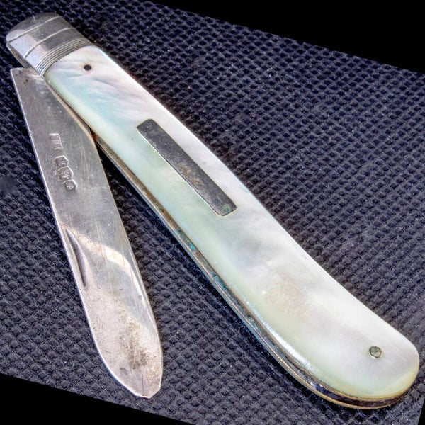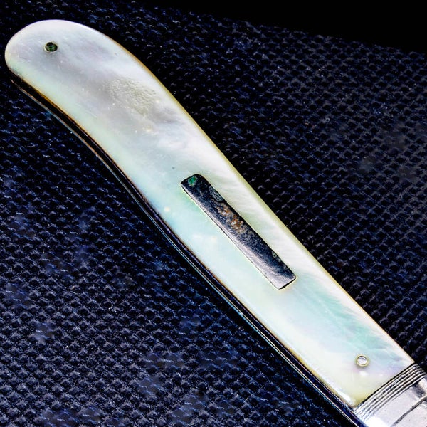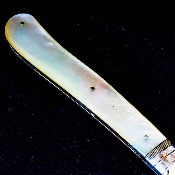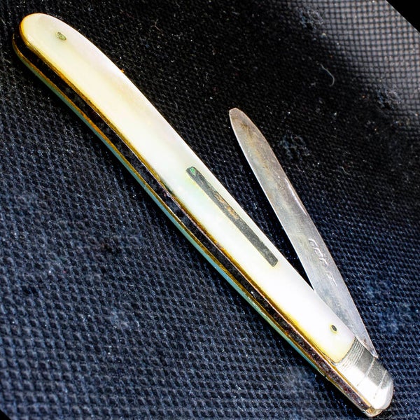This fruit knife has a well hallmarked sterling silver blade and unblemished mother of pearl scales. The maker, William Needhama recognised cutler, registered as a silversmith at the Sheffield assay office in 1891 and he became equally renowned. This example from 1927 for his silver work, especially fruit knives with folding blades. The blade, as noted above has the requisite hallmarks and makers mark and one scale has a small unadorned, unused silver plated, quite long, thin pate which hasn’t been engraved. The blade appears to have misused as a screw-driver or something similar in as much as it doesn’t seat completely into the recess, as can be seen in the images. There is also a small area of roughness at the point – again see the attached images. The knife is a total of 138mm with the blade extended and the handle is 84mm of the total length.