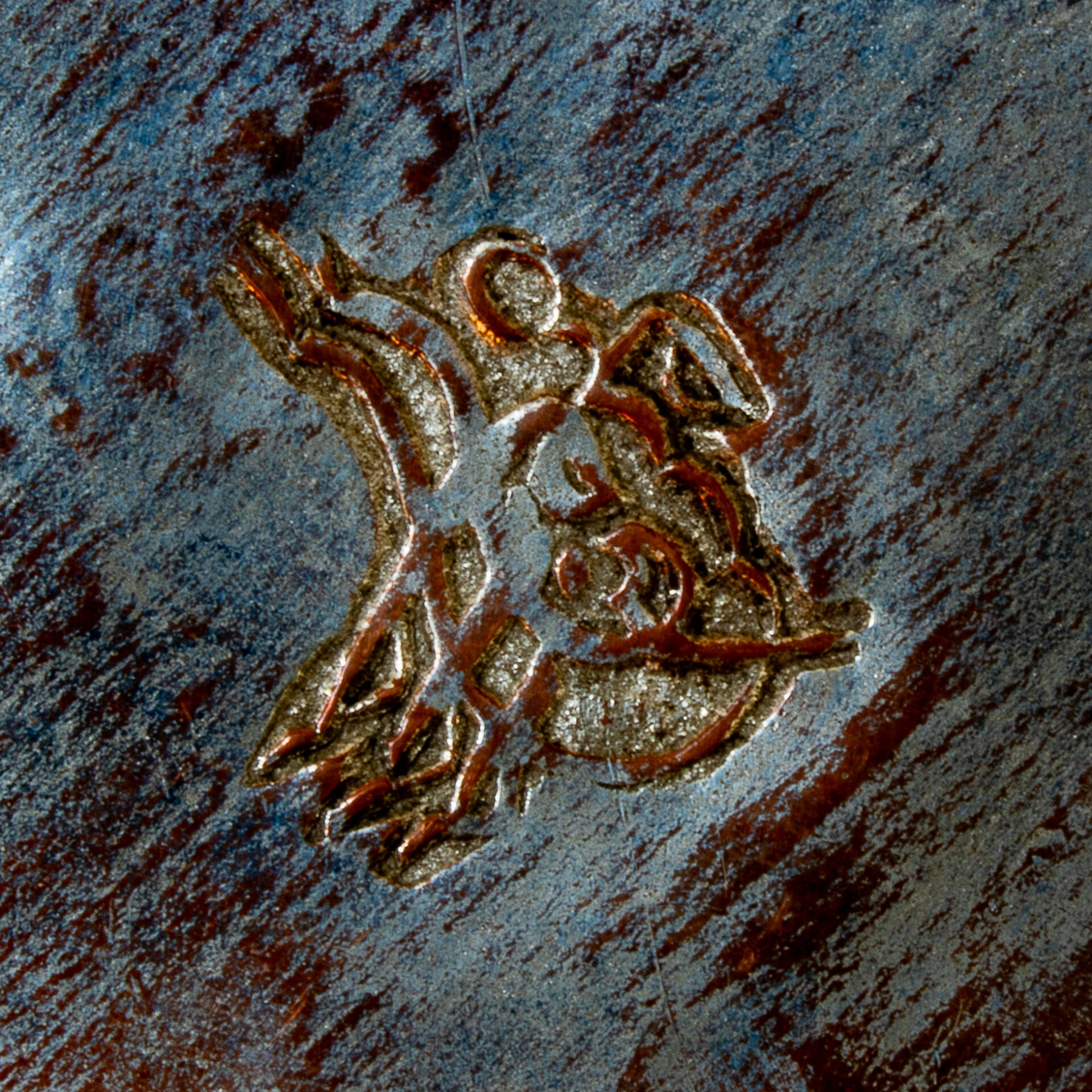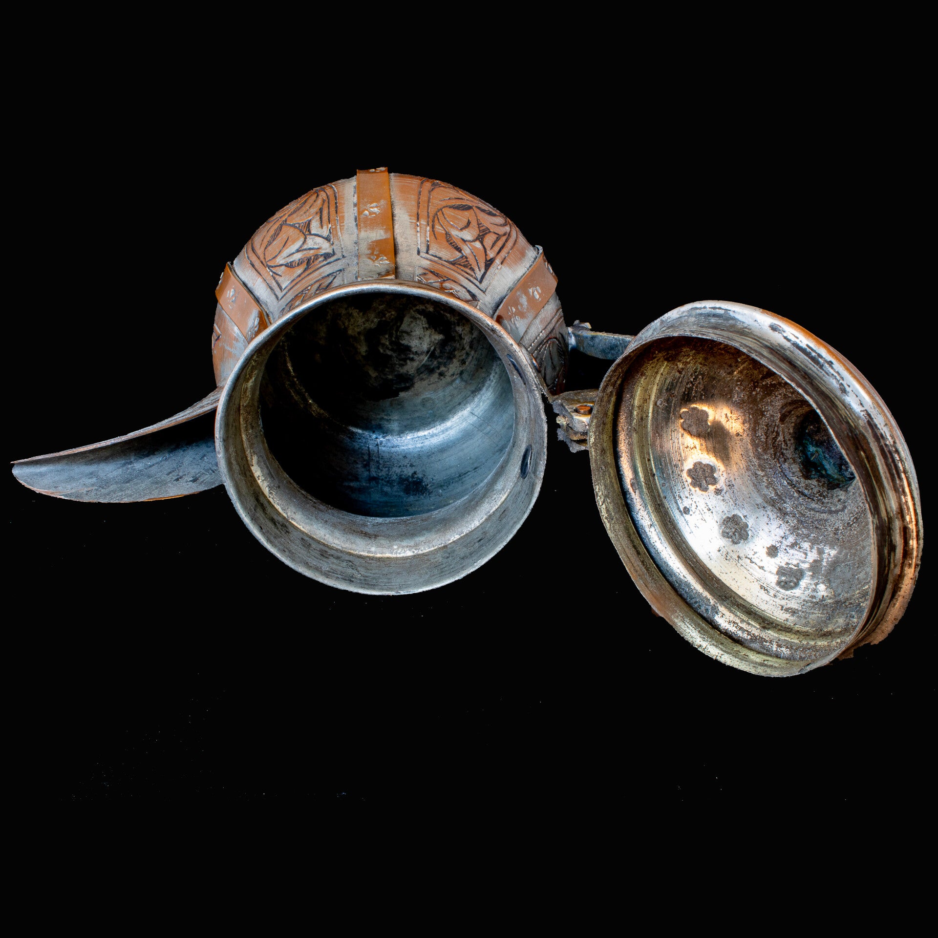 A small version of the traditional coffee pot used to brew Qahwa, a bitter Arabic coffee served to welcome guests. The Dallah is commonly used on the Arabian Peninsula and also by tribesmen of the Bedouin nation. Dallah appear to have been in use for centuries and they form part of the ceremonial welcome of visitors and generosity As can be seen in the images, the base metal is copper with a coating of tin on the inside and the coating on the outside may well be silver, befitting the ceremonial importance of the Dallah. The internal tinning was used to prevent leaching of copper ions into the coffee, which over time, could lead to poisoning. The pot has all the hallmarks of being hand hammered, with vertical banding to add strength to the structure and provide an additional decorative element. There is what we believe is likely to be a maker’s mark on the base but we have been unable to decipher it. The lid opens readily and the pot stands 157mm to the top of the finial.