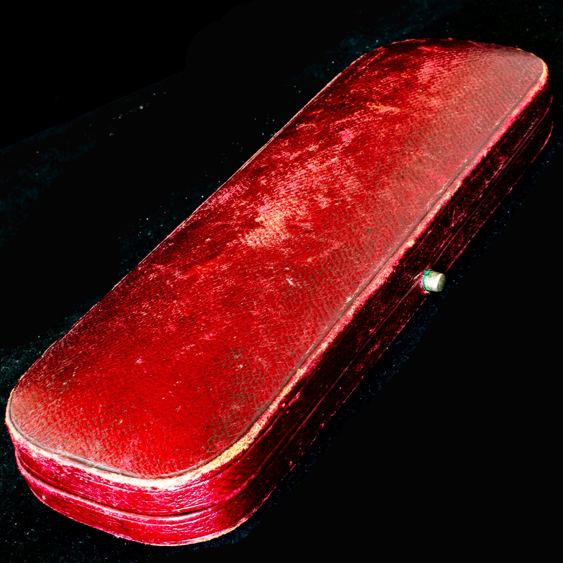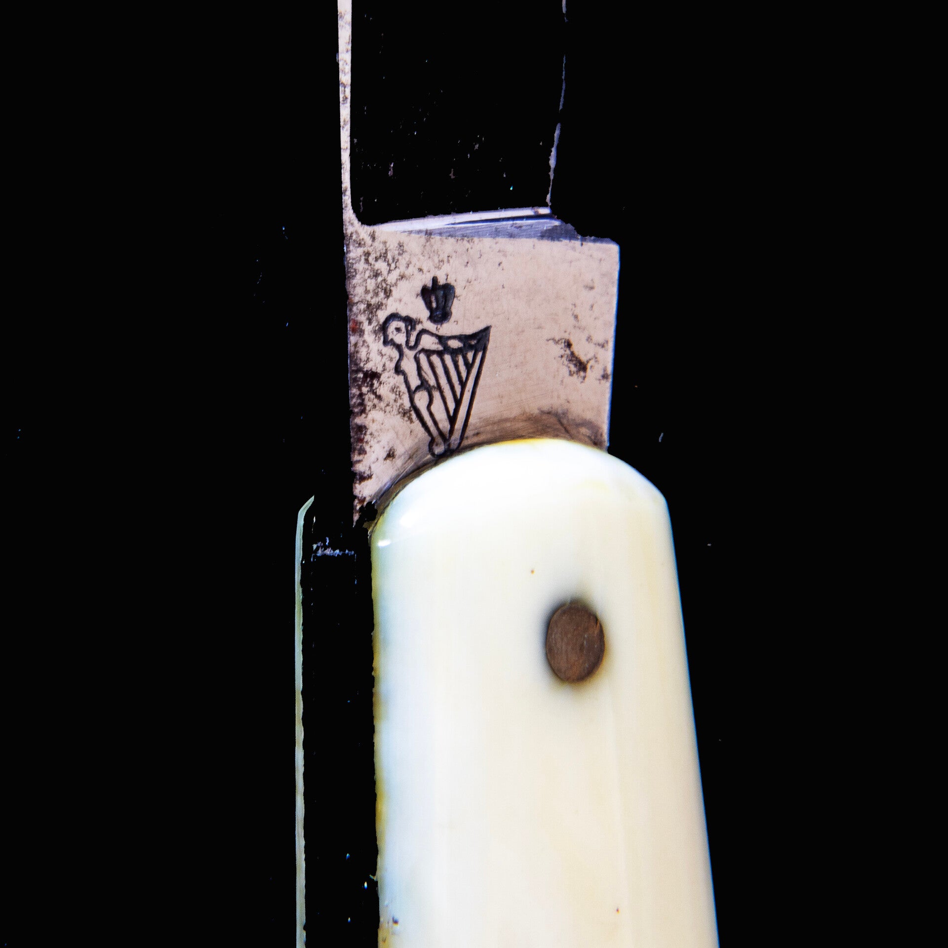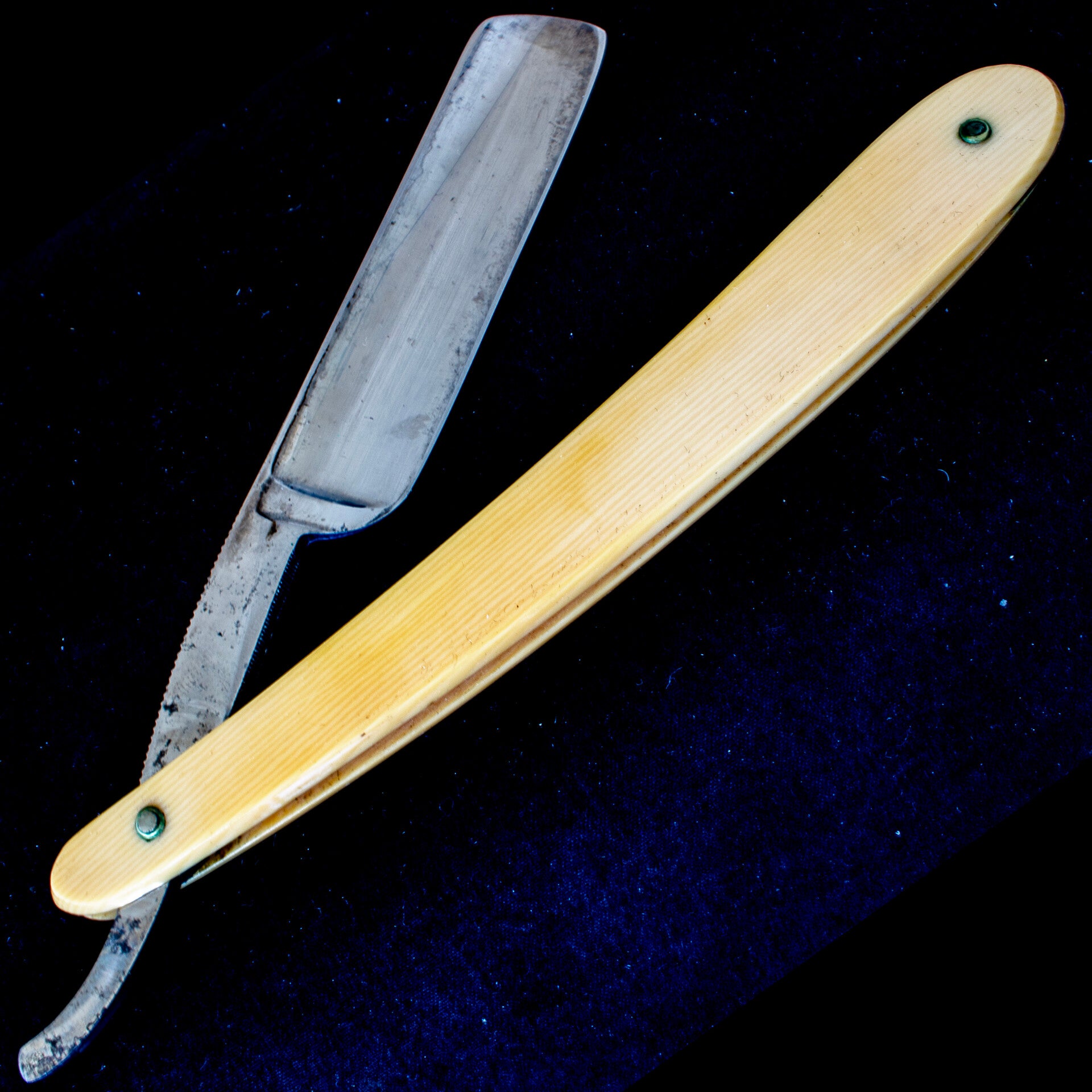 This cased set is a true find. Not only are the straight razors in remarkably good condition but the set includes a branded foot care / corn trimmer folding knife and a celluloid nail care pick and cuticle tool. As partners came and went, this business had a number of name modifications, but best evidence suggest that the Wade Wingfield and Rowbotham name was only in use between 1816 and 1850. While is not possible to fine down the date of the set, it at least must fall within those 34 years. This is also backed up by the relatively small bend in the handle – the earliest straight razors were exactly that – straight, this set somewhat later but not like the modern handles, bent to fit the grip more readily. Both blades are emblazoned with a quote from Shakespeare and the blades have minor discolouration but no rust or damage to the edges. The company name appears below the jimps and fully extended teach razor measures 245mm. The handles are 146mm long and the blade (including the tailpiece which has not previously been included), measure145mm. The scales on both razors are celluloid while the scales on the corn knife appear to be bone as does the nail care tool.. There would have been a third tool but this was not present when this set came into our possession 25 years ago. There is wear commensurate with age but careful treatment, and we would be confidant that a buyer with the knowledge and skill to do minor refurbishment would have a treasured set to be proud of.