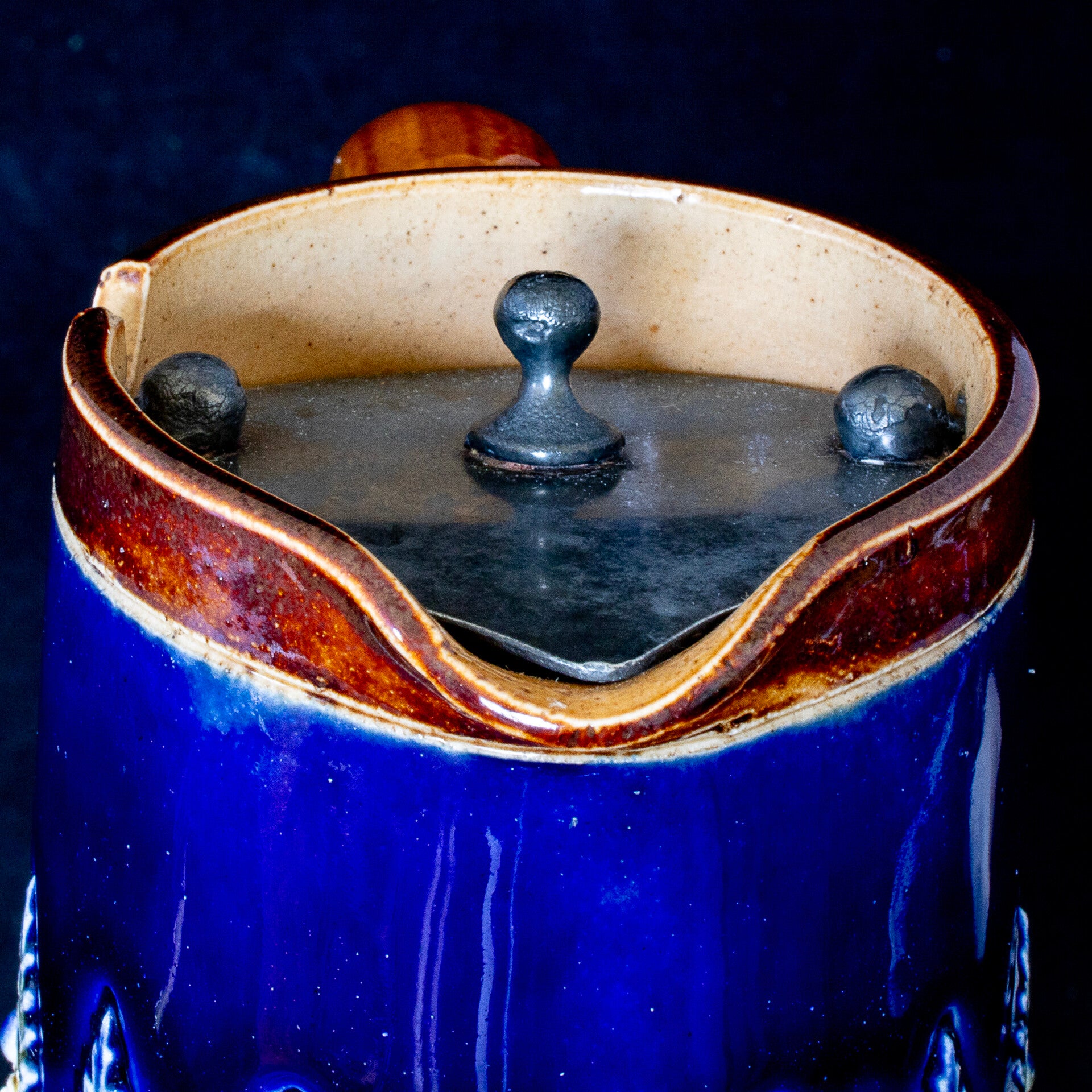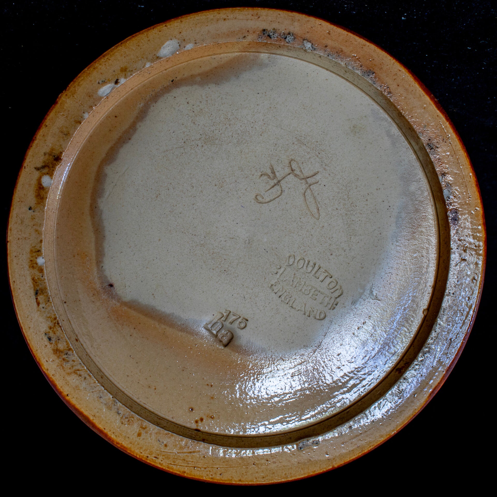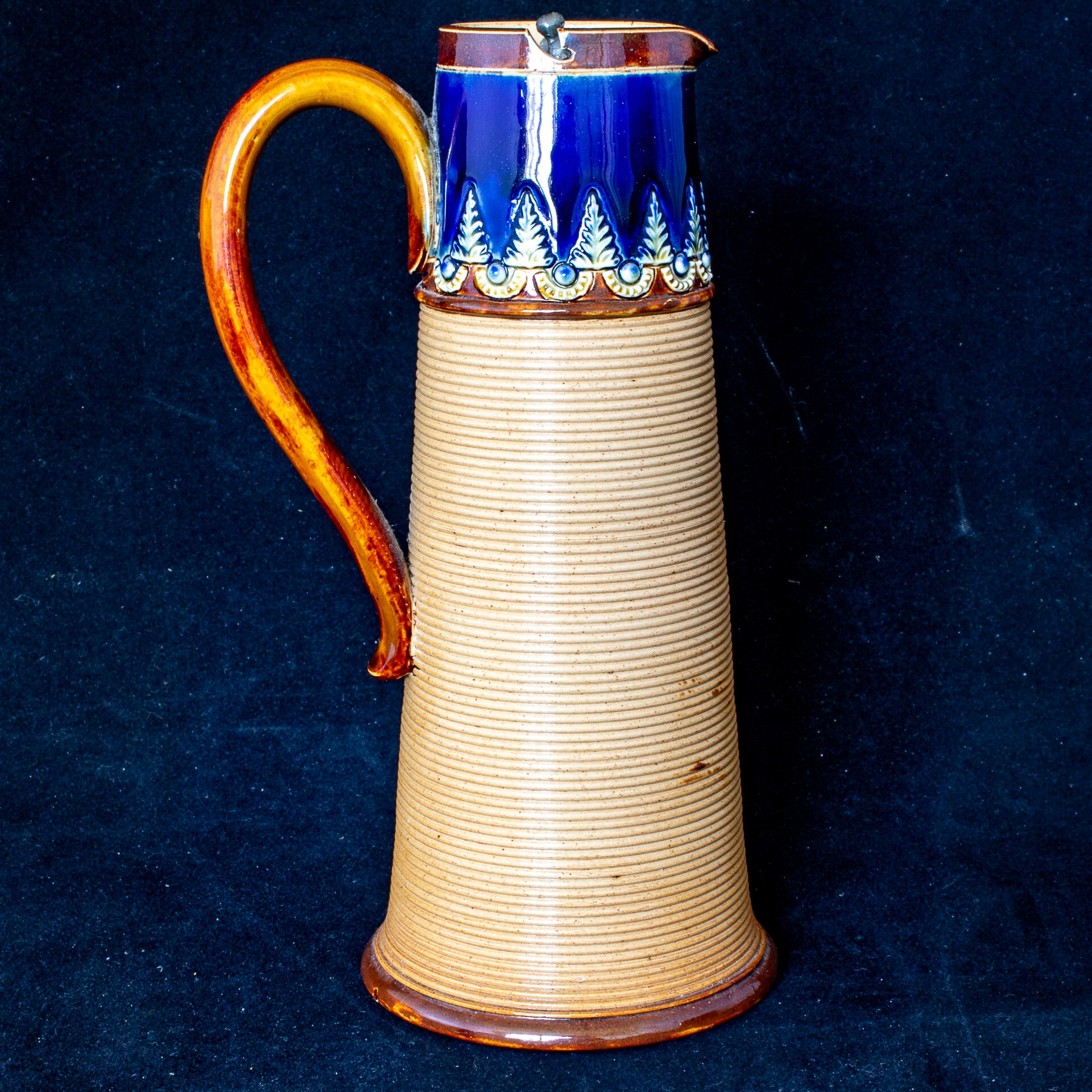 This tall tapering jug has an elegant line, with a frieze of roundels and leaf in a distinctive blue glazed band toward the top of the jug and a close ribbed design over the greater part of the body. The lid is self closing and appears to be pewter and presents as being in good original condition. The incised pattern number of 175 identifies this pattern as being one of the earliest and supports a date of around 1891 for the jug. There is also an incised ‘ha’ and scratched initials of the decorator – FJ (however I have been unable to identify these to a particular individual). The jug stands 8 7/8“ (225mm) tall, on base with a diameter of 3 15/16” (100mm). For a pre-owned, pre-used item, this jug is in excellent condition. There is some spots of discolouration in a couple of places, which appear to arise from the stoneware itself. Decorator’s initials of FJ are incised by hand in the base.