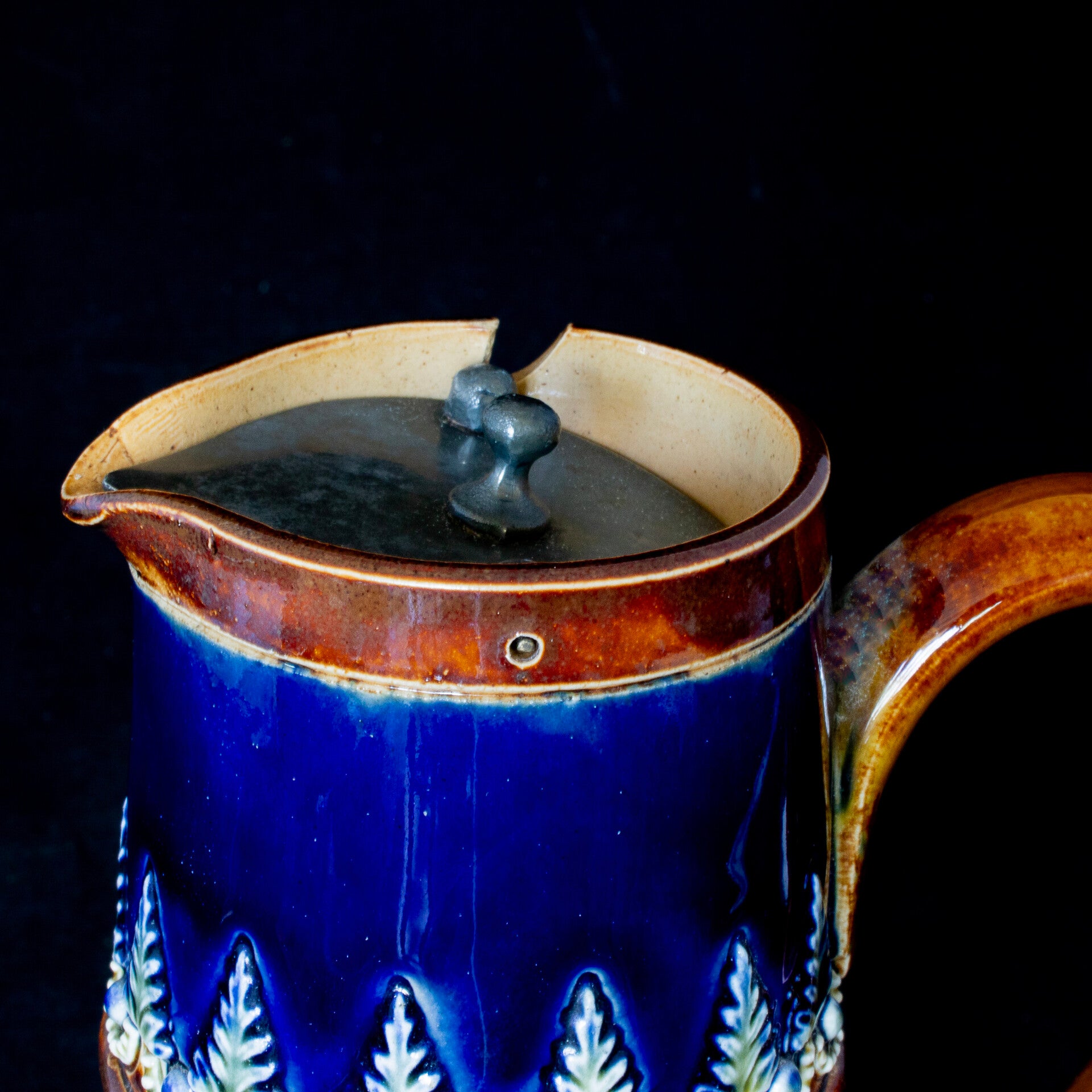 #stoneware #jug #doultonlambeth #doulton #circa1891 #blueandcreamglaze #roundelsandleafpattern #selfclosinglid #pewterlid #patternnumber175