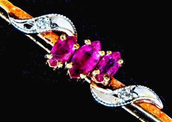 #barbrooch #threerubies #twodiamonds #9caratgoldbar #9caratwhitegoldsholders #marquisecutrubies #roundsinglecutdiamonds #valuationprovided#auldcuriosities.com #dunedin #newzealand #antiques #vintage #curios #collectables