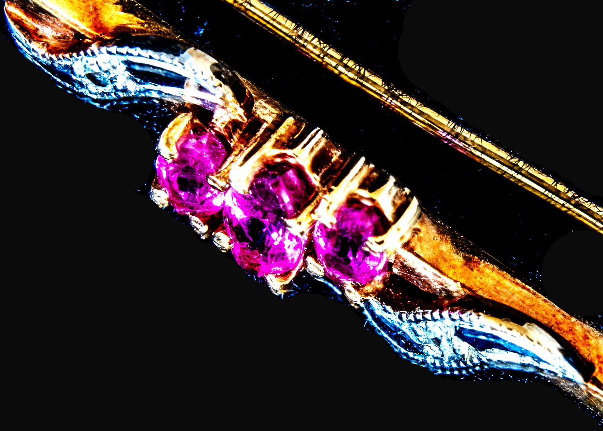 “3 stone Ruby bar brooch, with 2 shoulder Diamonds in 9ct yellow gold and white gold. all hand made mount, yellow gold claw mounts for Rubies, small white gold S shaped shoulders, tapered 45mm yellow gold bar with chamfered ends, total weight approx.. 2.15grms.