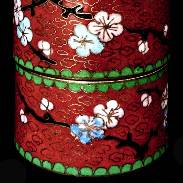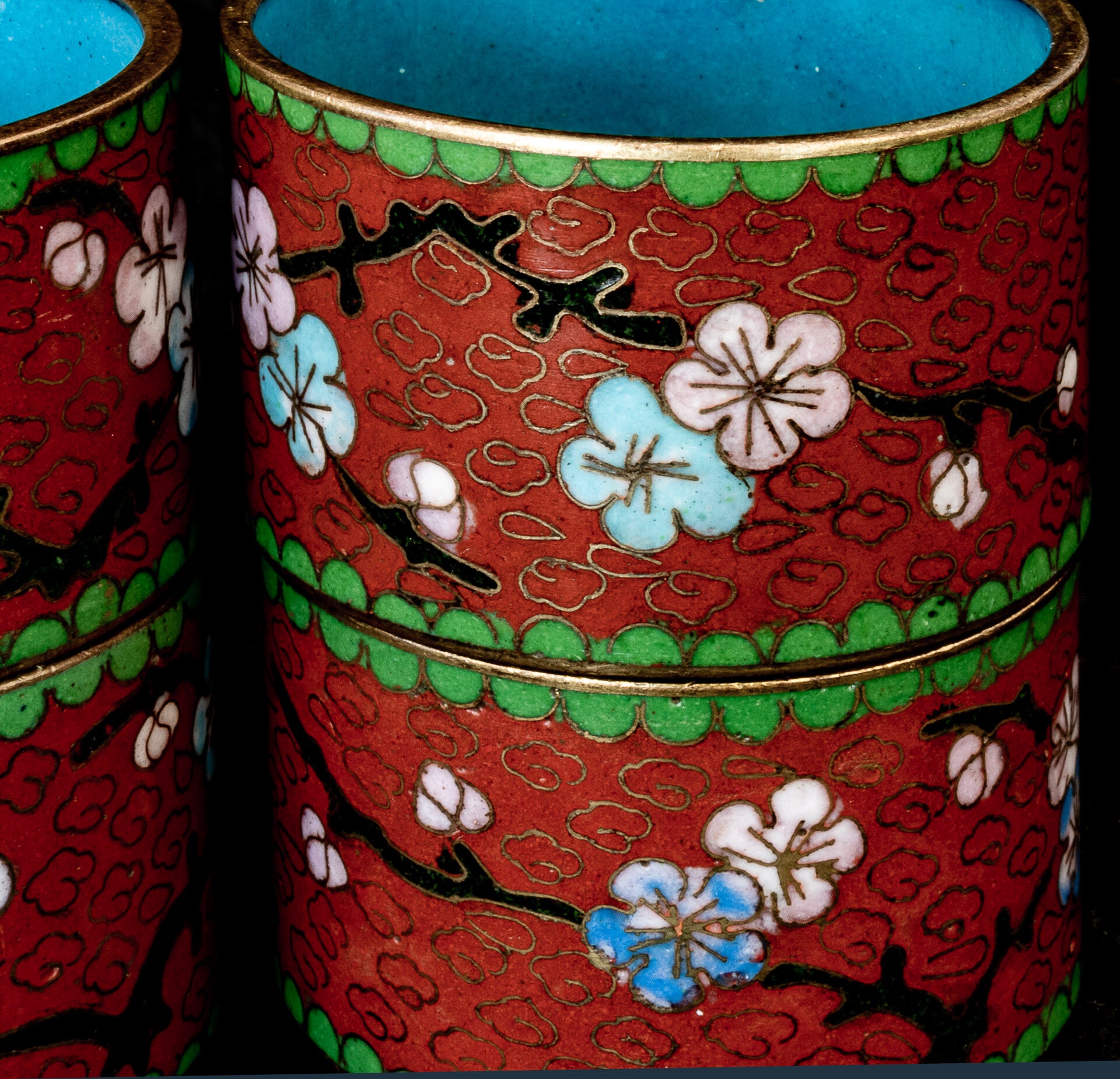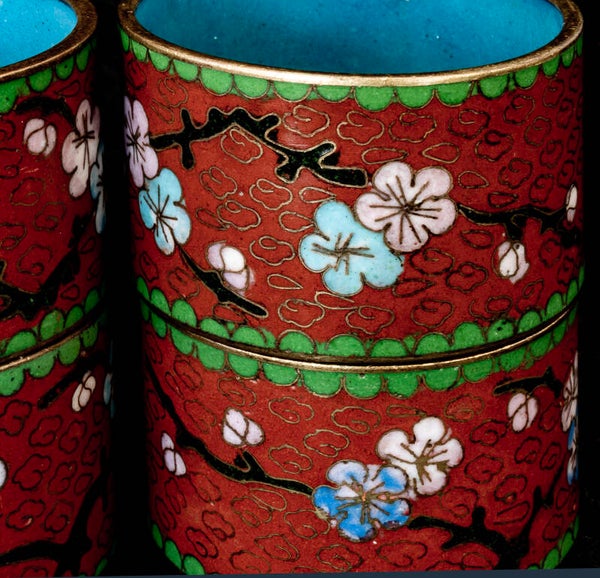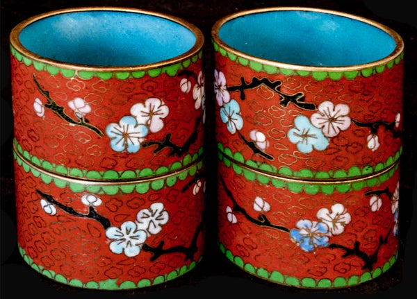 Mid 20th century napkin rings with brass base and brass cloisonnes separating the frit until molten into glass. The design is rather nice, I imaging referencing Spring with the blossom out on the branch. All four napkin rings bear exactly the same pattern suggesting a mechanised rather than solely craftsperson approach, but none the less an attractive group for use or display. Each ring has an inner diameter of 47mm and a depth of a smidgen under 32mm