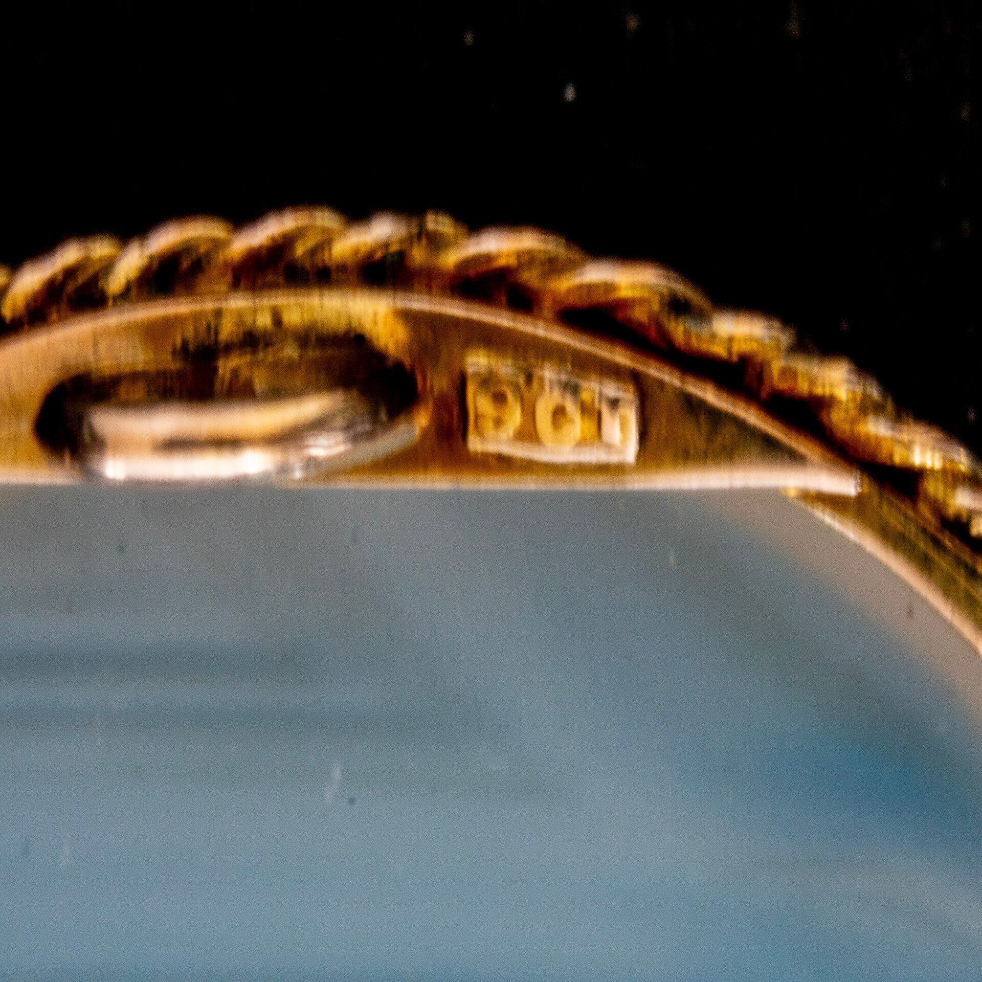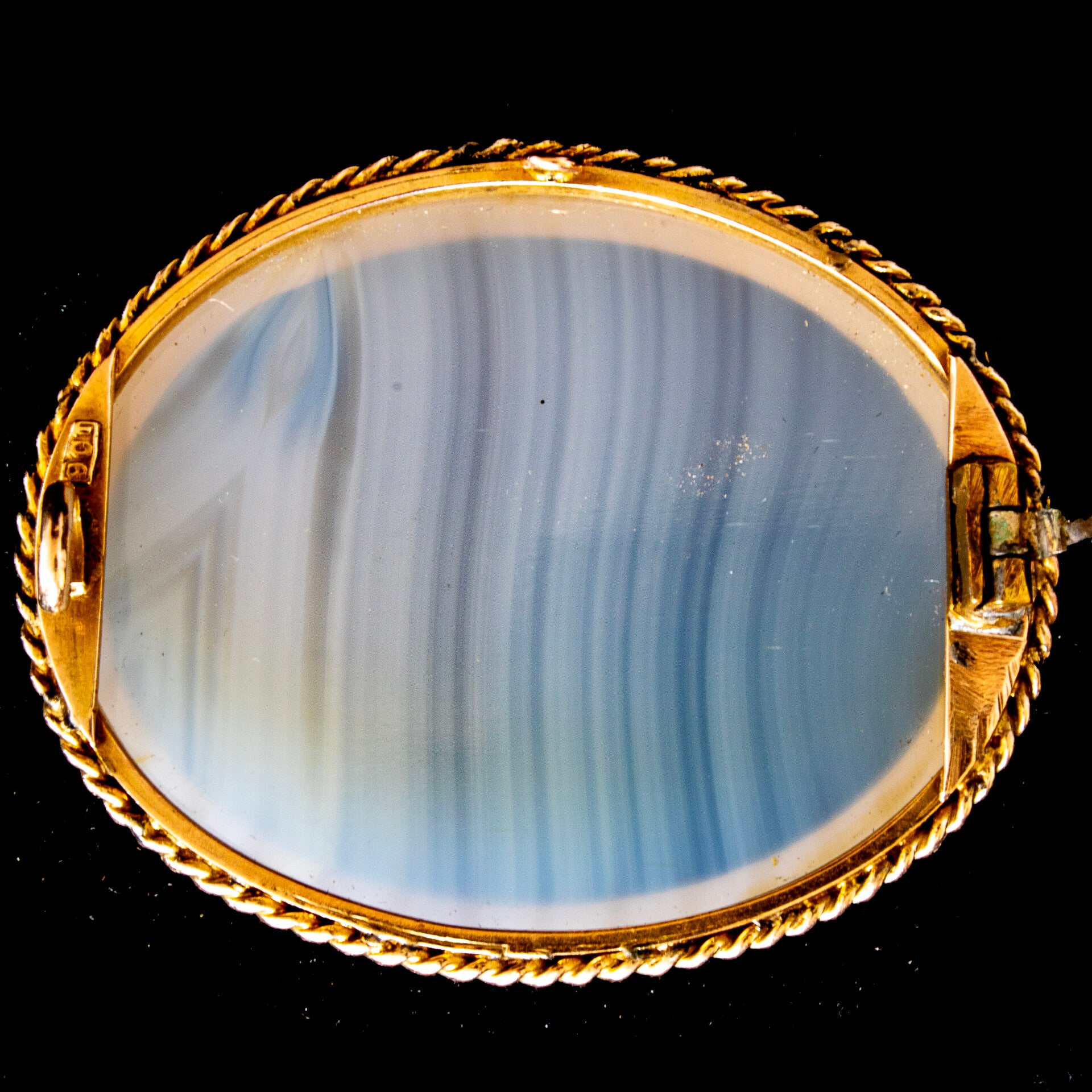 Rare striated natural white agate, cut to an oval in a 9ct gold framed brooch