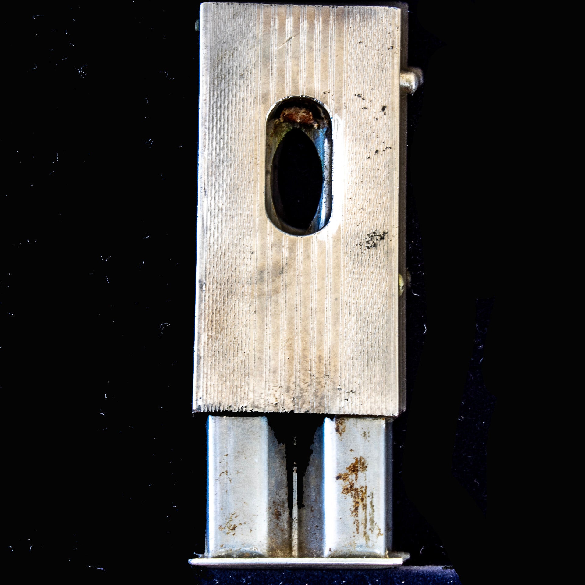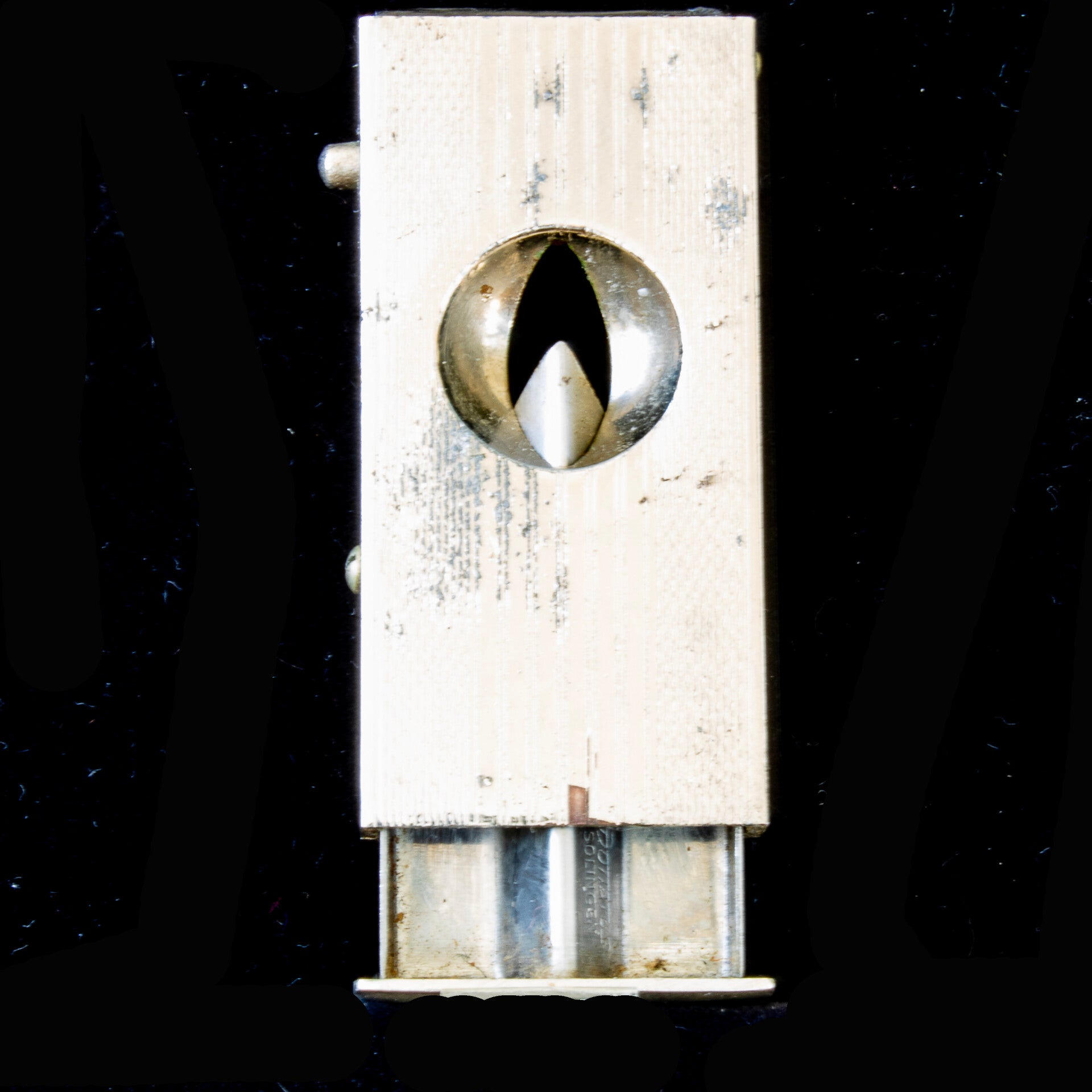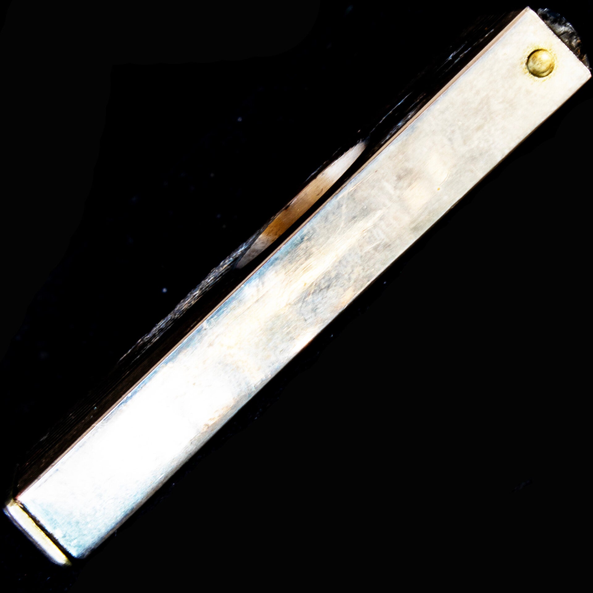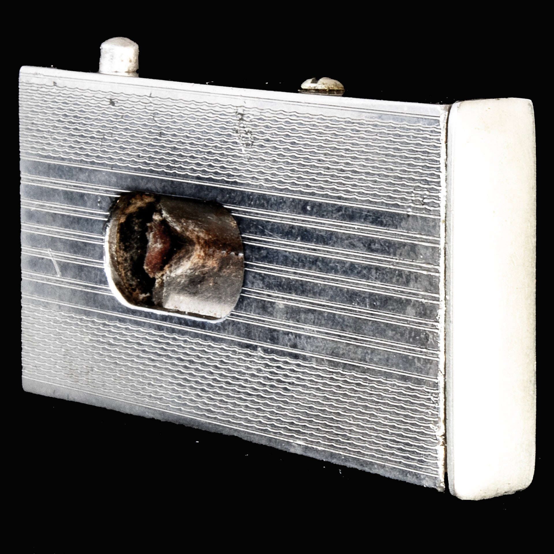Auld Curiosities has found a number of images of this model of cigar cutter which all seem to date around the early 1940’s, with the same pattern of machine engraving on the body all made by Solingen of Germany. The trimming of the cigar end is not by spring action but very much under user control. The ‘V’ shaped blade would, we imagine, slice the tobacco leave with ease. The cutting action compresses the spring loading mechanism and a simple press of the button (see images) would clear any debris for the next use. Unfortunately, the chromed body seems to have been exposed to dampness and the chrome coating is blistered in places (see images), more on the user side than the other. The cutter measures 55mm long by 25mm wide and 7mm deep.
