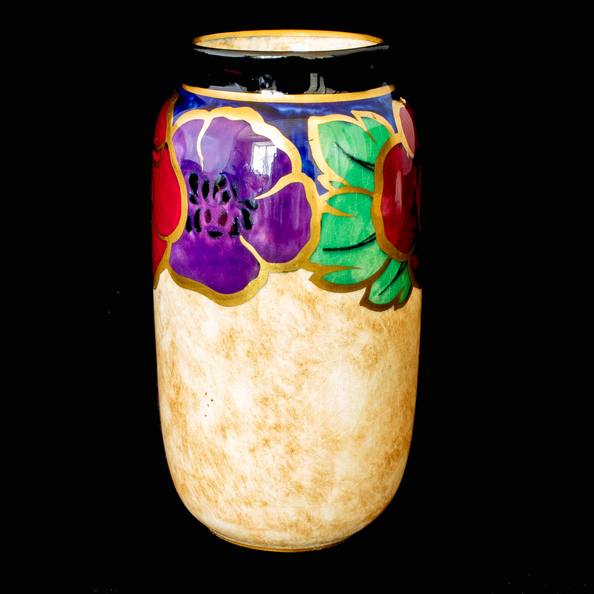 The Auld Curiosities is pleased to offer, for your consideration, a small vase by the Regal Pottery Co. in the “Poppy” pattern. The Regal Pottery Company was based in Stoke on Trent, England between 1925 and 1931and dealt mainly in earthen-wares. The Poppy pattern was mainly produced for dinnerware and display pieces. There is a printed mark stating that the piece was hand painted by C Burton - who frankly was one of Regal Pottery’s most talented decorators. The marled beige ground is surrounded by bold florals in striking colours and highlighted by gold trim on the petal edges and the black edging to the octagonal shaped plate serves to add a degree of impact to the overall presentation. This is a pre-loved piece that appears to have minimal signs of wear and no obvious abuse or damage, however a limited amount of crazing is seen on the underneath surface. The vase measures 4 7/16” (113mm) tall and has a diameter of 2 1/8” (53mm)