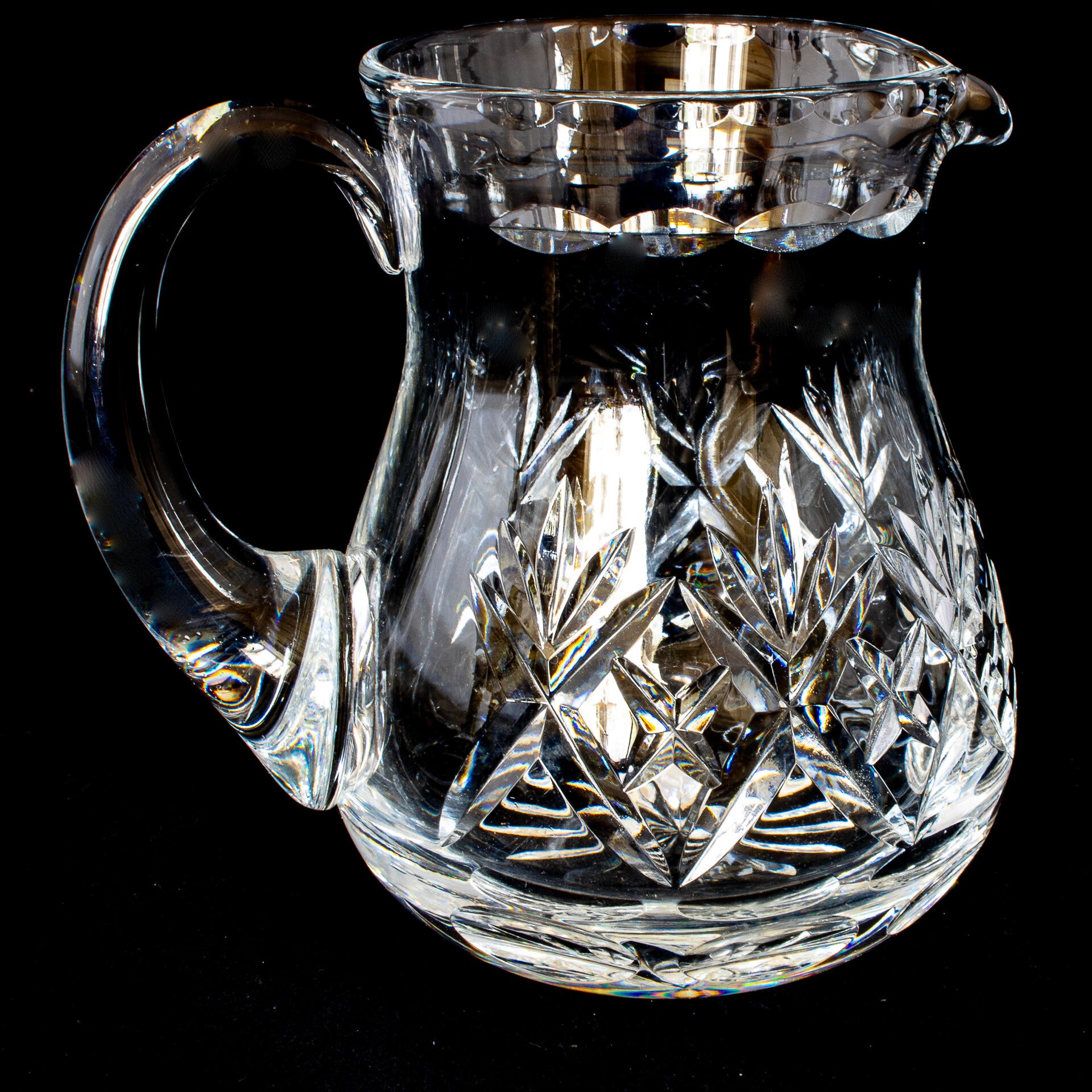 Auld Curiosities has been slowly working through a small collection of Webb Corbett crystal and tonight would like to add this attractive and useful crystal jug to the inventory. This is a very solid feeling piece of crystal, expertly fashioned and cut. The capacity of the jug is 17 fluid ounces (500mls) when filled to the cut crystal ovoids, about ¾” (20mm) below the rim or 600mls when taken closer to the rim. This style of jug was made as a water jug, suitable for the bar top. The acid etch on the base is clear and includes the number 66, indicating (I believe) the year of manufacture, in this case 1966. The jug stands 5 1/8” (130mm) tall and although pre-owned, the condition is excellent.