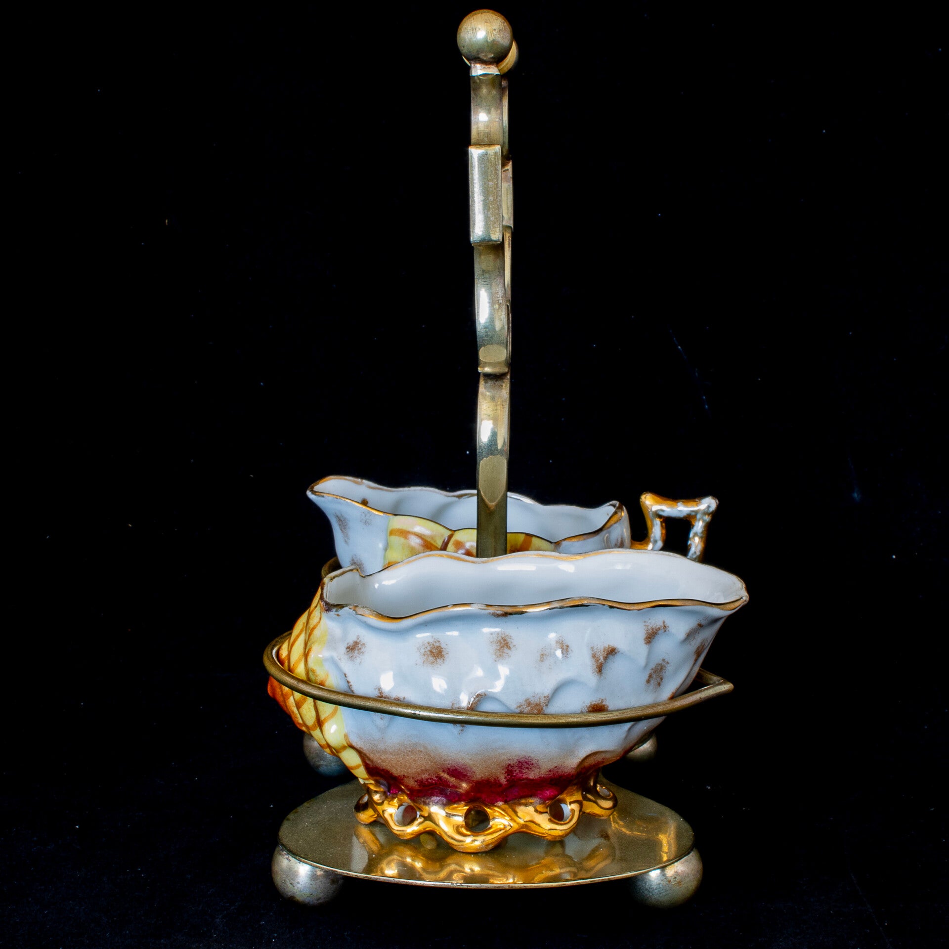 Cruets were in daily use on the tables of the ‘rich and refined’ in the first part of the 20th century, but the time WW1 and WW2 had changed the fabric of daily life, a less formal attitude to such things, plus television, saw the general demise of cruets. This set is interesting, the quality of the porcelain is exceptional and the cruet frame has been meticulously shaped to fit. The metalware is a base type metal, that perhaps had been silver plated no evidence of that is seen on the wire frame. The base plate still shows some evidence of the silver plating and also carries the ‘Made in England’ stamp. The handle of the cruet has the appearance of ivory but in fact I think it is celluloid. So the frame is showing age related tiredness but the porcelain remains bright and free of distress or damage of any kind. The cruet stand son four small ball feet and reaches a height of 205mmm. No indication of the maker for the cruet frame or the porcelain. Fair wear and tear for age and no actual damage found.