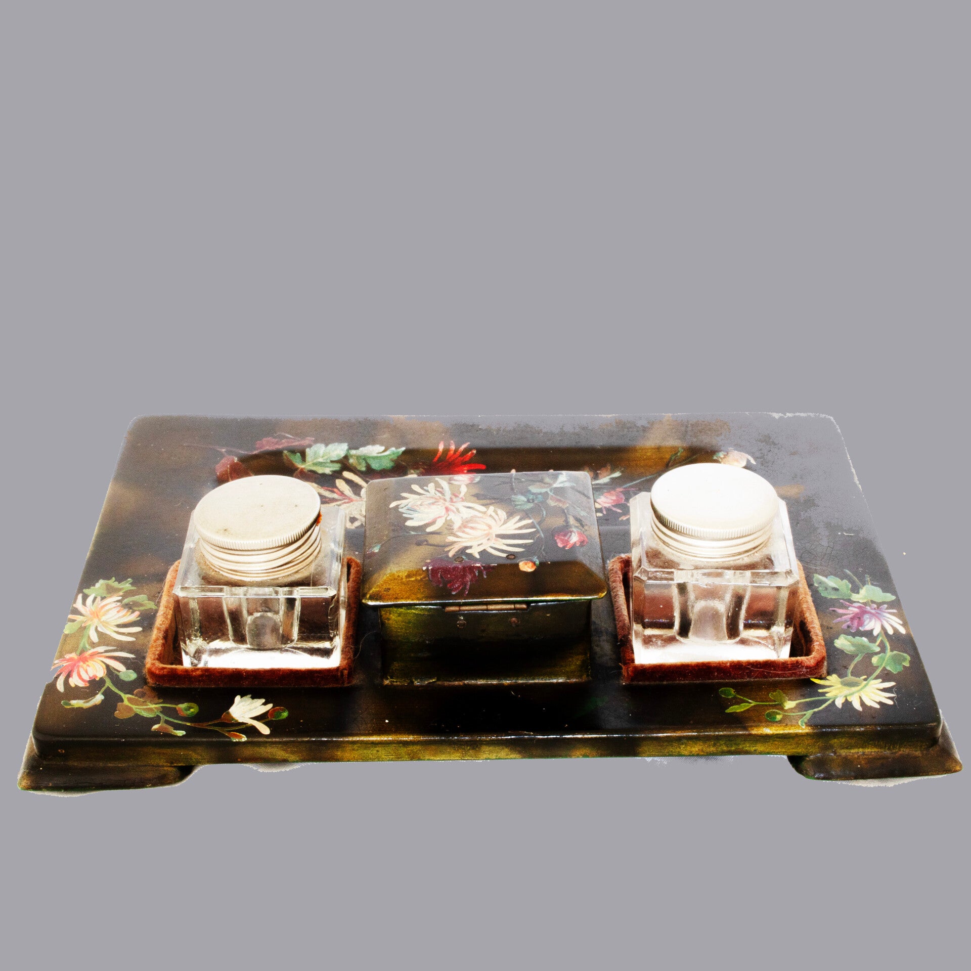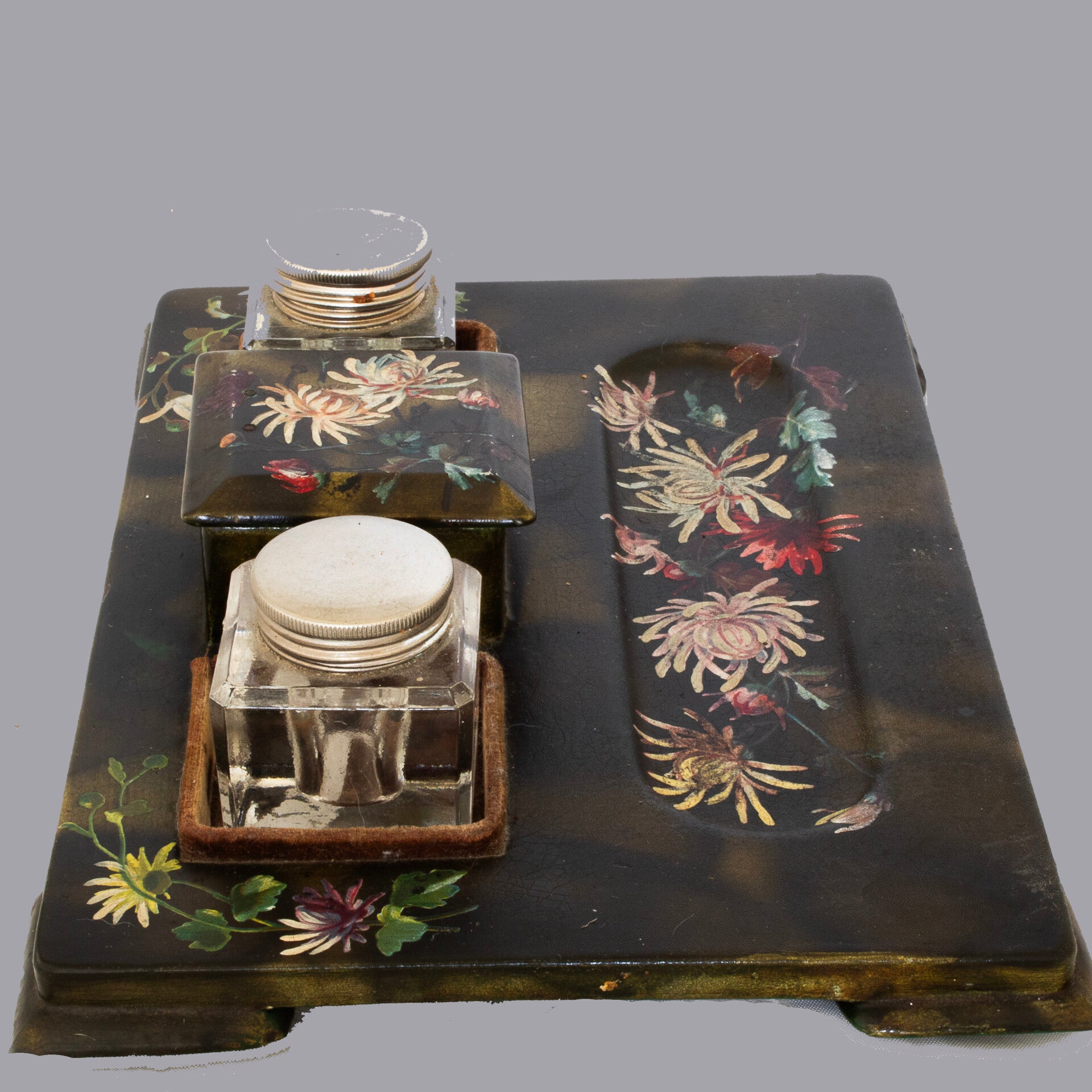 #standish #deskset #papier-mache #chrysanthemums #edwardianera #earlymidcentury #twoinkwells #glassinkwells #stamps #velvetlined