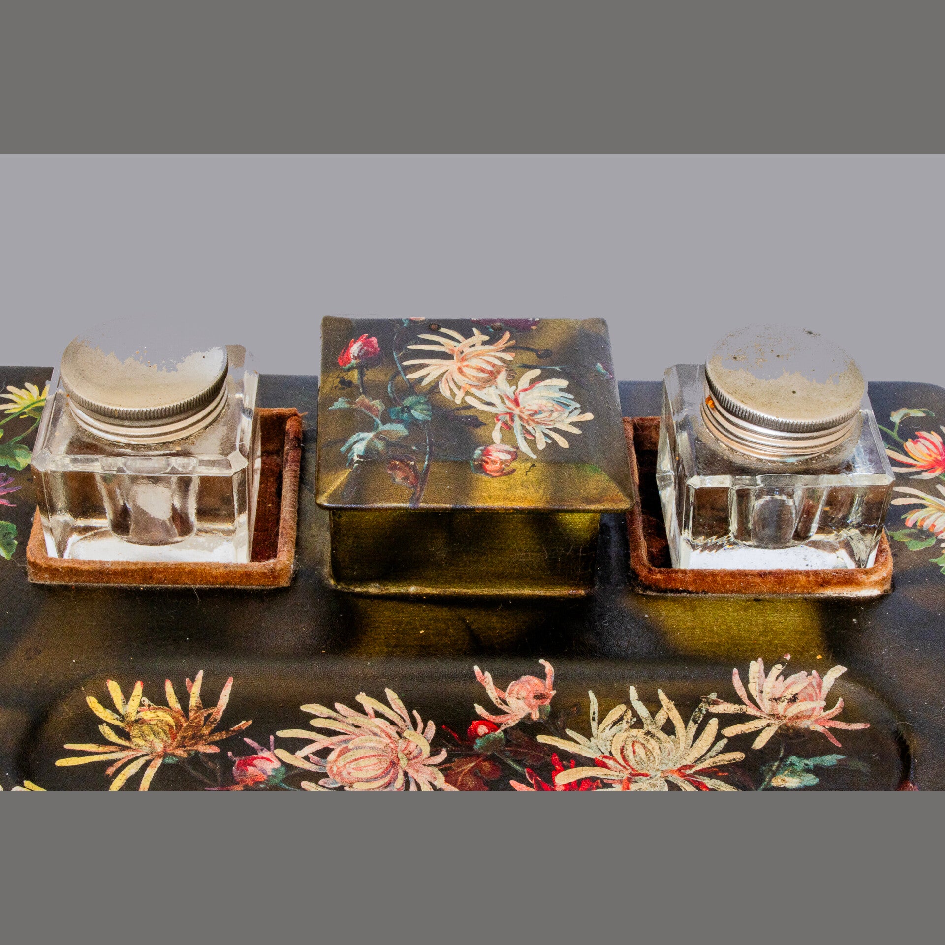 Decorated standish (desk-set) with two inkwells and a nib/stamp compartment