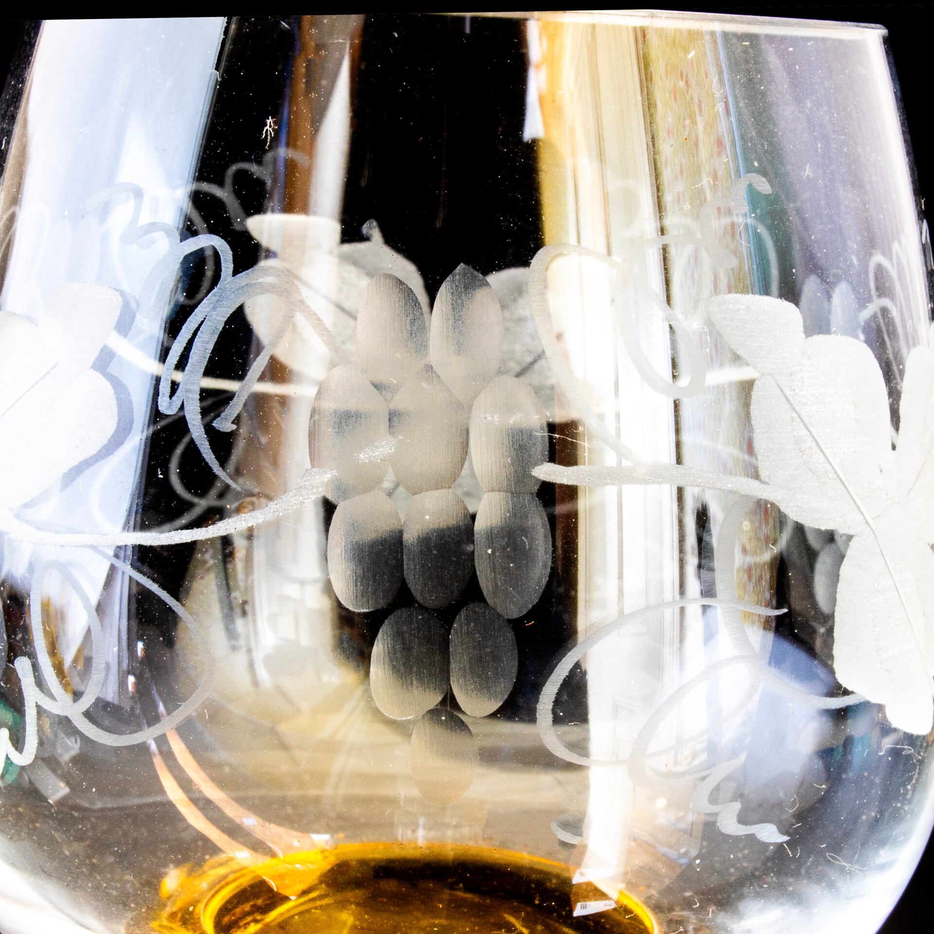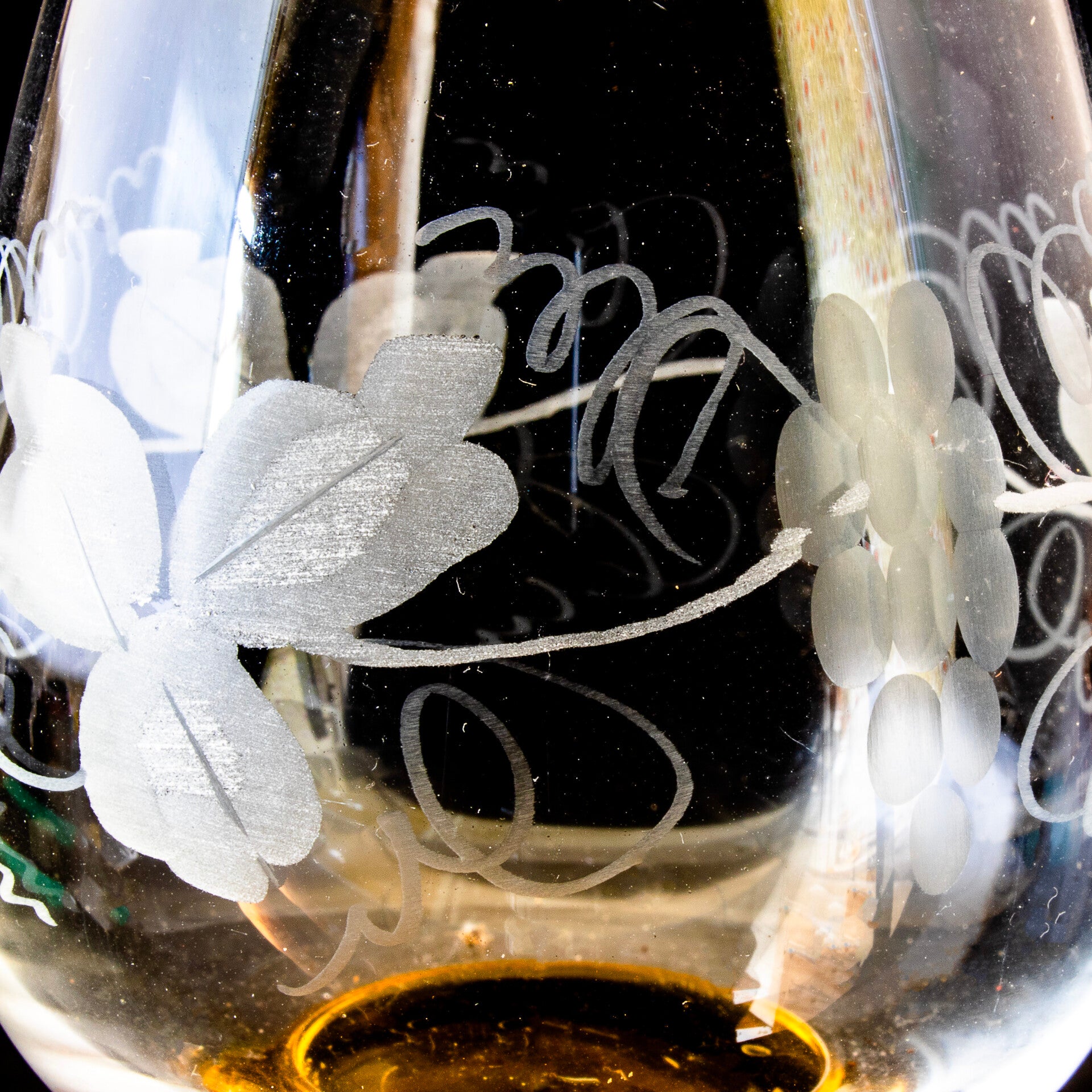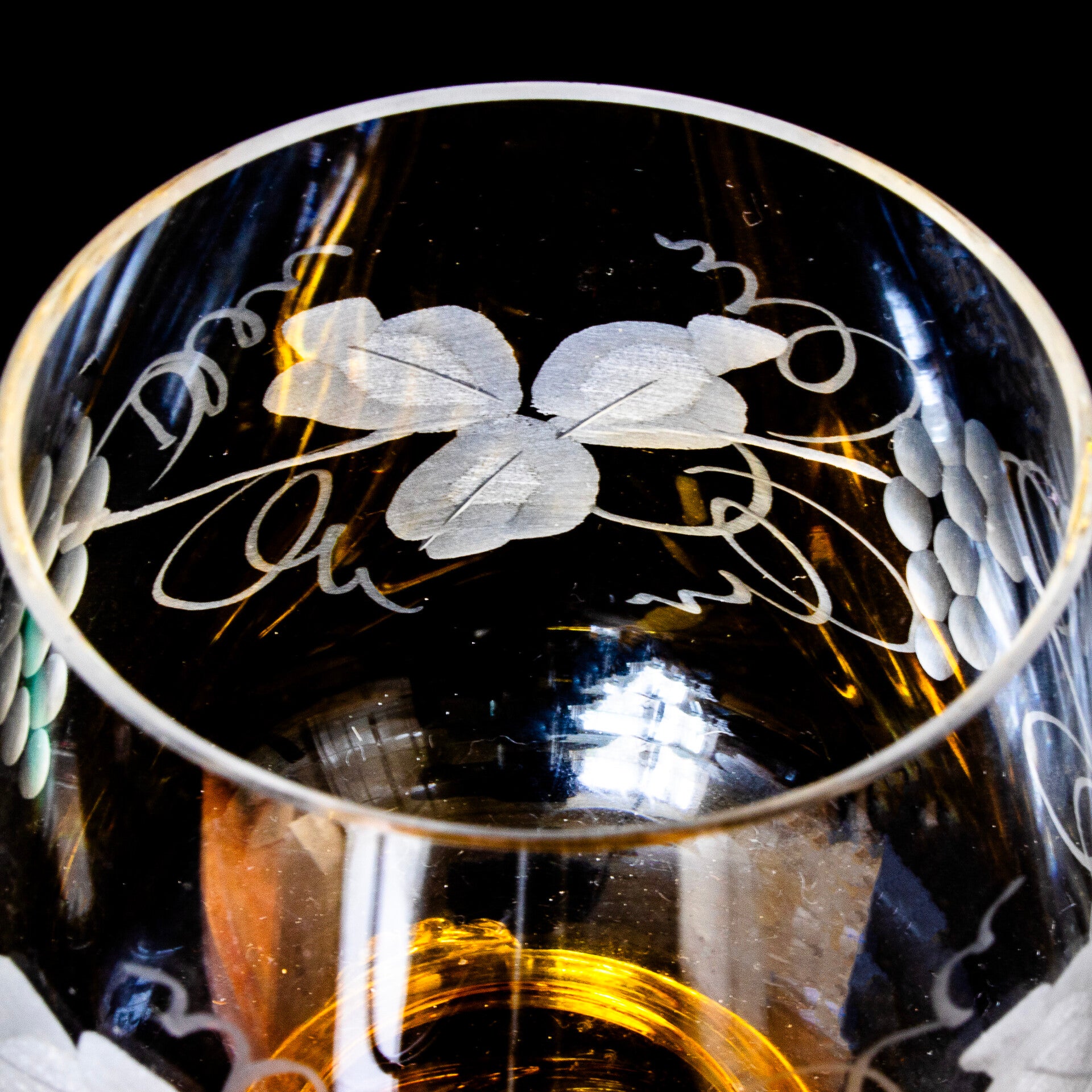 Auld Curiosities is pleased to offer a matched pair of Theresienthal Roemer cordial/wine glasses for your consideration. Theresienthal is renowned Bavarian glassworks that that can date its start back to the early 1800 and in some publications perhaps back to the 1600’s. The glasses stand 148mm tall on hand blown stems and the bowl has a pattern of leaves and grapes. The stem, as can readily be seen in the photograph, has a bulbous/ribbed form with three equally spaced rosette nubs spaced 90 degrees apart around the front three-quarters around the stem and is amber hued. This specific glass design appears the catalogue “The Beautiful Glass” before 1960 (though could be earlier). Condition is excellent with no chips, nibbles or scratches found.