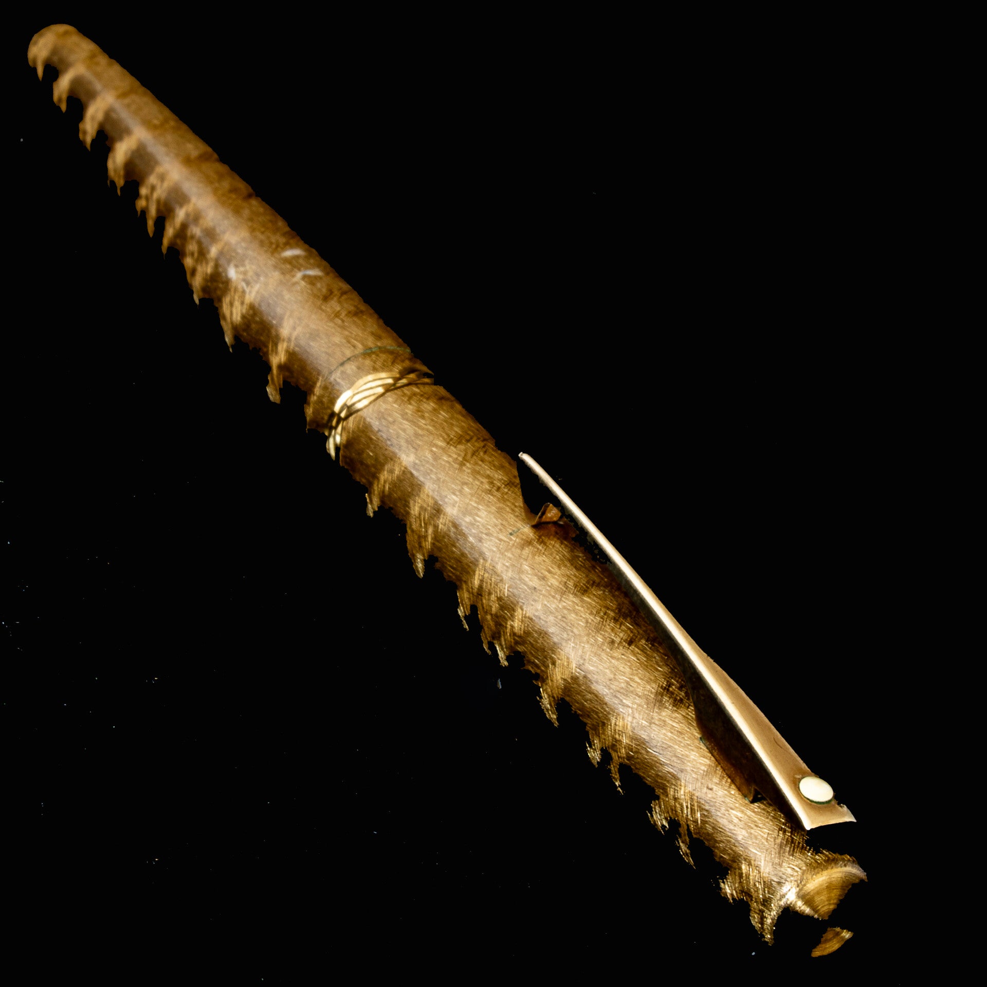 This 1960’s Lady Sheaffer 903 fountain pen with the “Moire” finish to cap and barrel is another treasure from Auld Curiosities. This American pen company started in 1912and grew to be a leader in the industry due to innovation and a commitment to quality that allowed the offer of a lifetime guarantee for each pen (denoted by the white dot on the shirt clip). By the late 1950’s Sheaffer pens had distributers throughout many countries, including Australia, as can be seen by the nib of this pen. The “Triumph” style 14K gold nib is nib is stamped as a 585 with the Sheaffer logo and Australia. The pen is 5 ½” (140mm) posted and is being sold untested. We recommend a full check of the ink passages etc, as with any pen we sell.