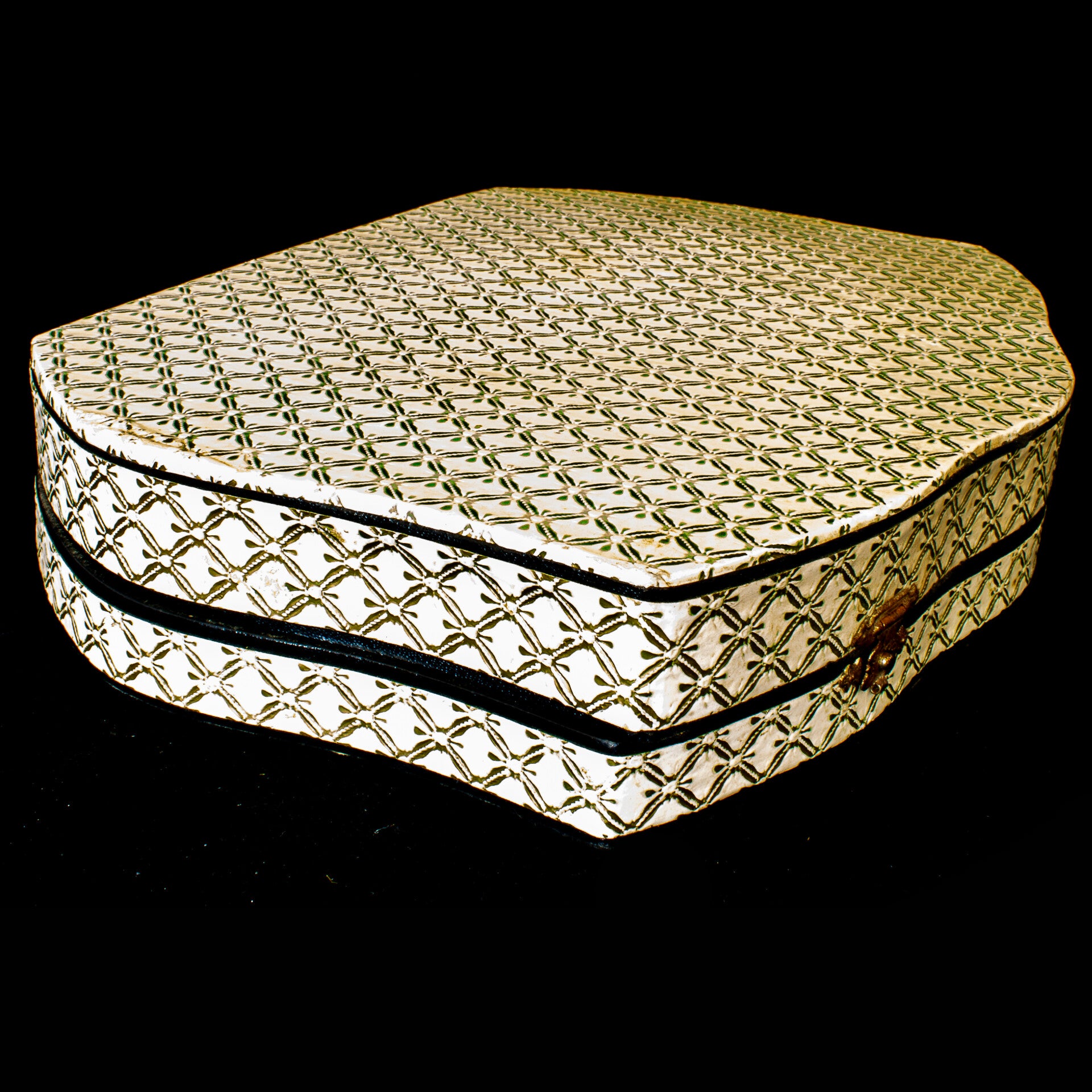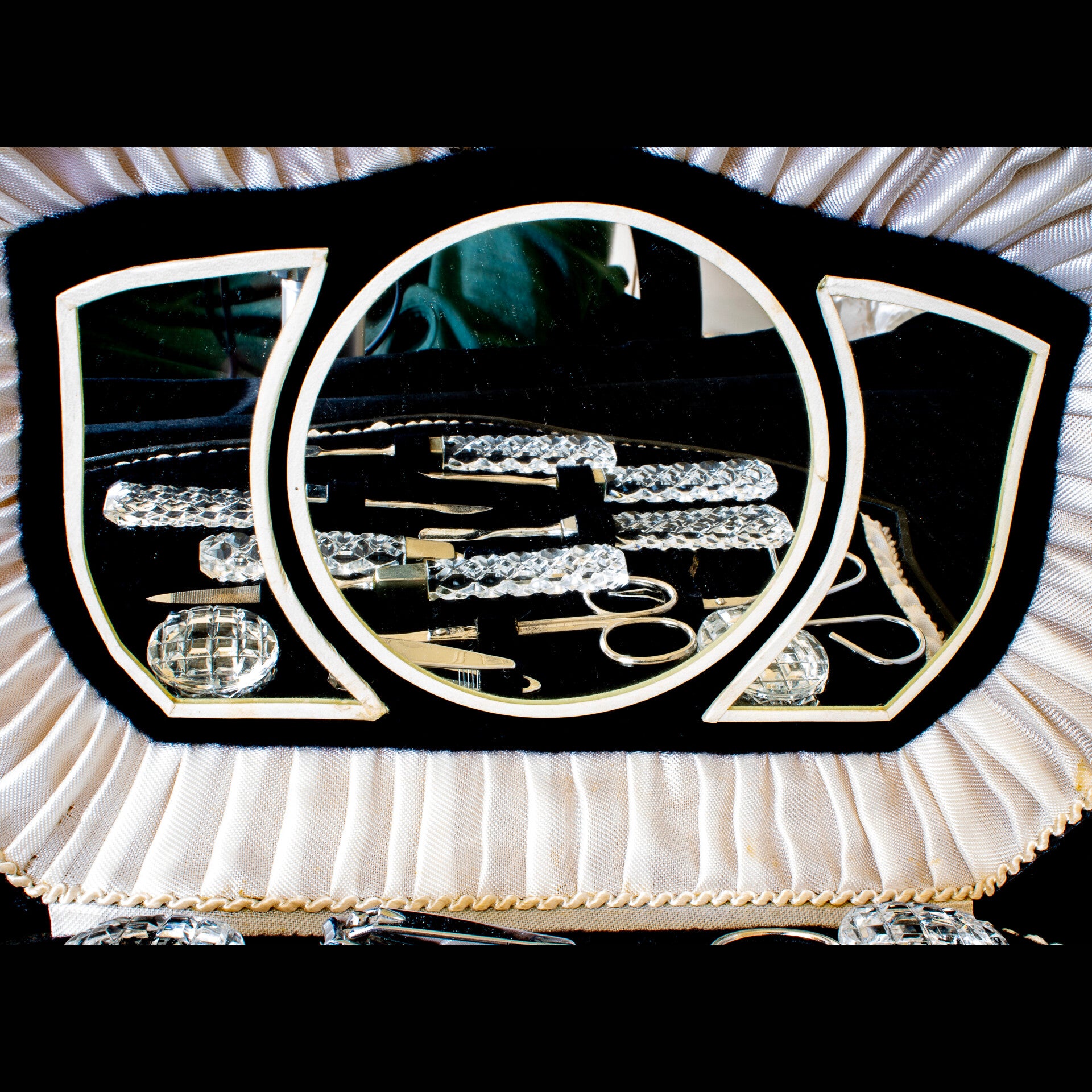 This item is very much a charming, early to mid-century manicure set. From the light but solid wood case, to the clear-cut glass used in a number of utensil handles, it speaks of luxe for its time. The case cover is like a heavy embossed card finish and has a design leaning strongly toward the geometric. Two small closure clip fasteners in brass, as are the two rear hinges. The set appears quite comprehensive and includes: two small lidded cut glass pots; nail clippers; Scissors with a curved cutting surface; eyelash tweezers; a cut glass handled nail file; five cut glass handled cuticle pushers and trimmers for various cuticle treatments and of course the triple mirror lid. All implements are set in black velvet surrounded by ruched cloth emphasising the luxury effect of the whole unit. The case measures 265mm at the widest point, 195mm front to back and has a depth of 50mm. In ‘as new’ condition in every way other than slight corrosion being seen on the chromed metal (in places under magnification. Enough items stamped as being made in Germany to assume the whole set has originated there