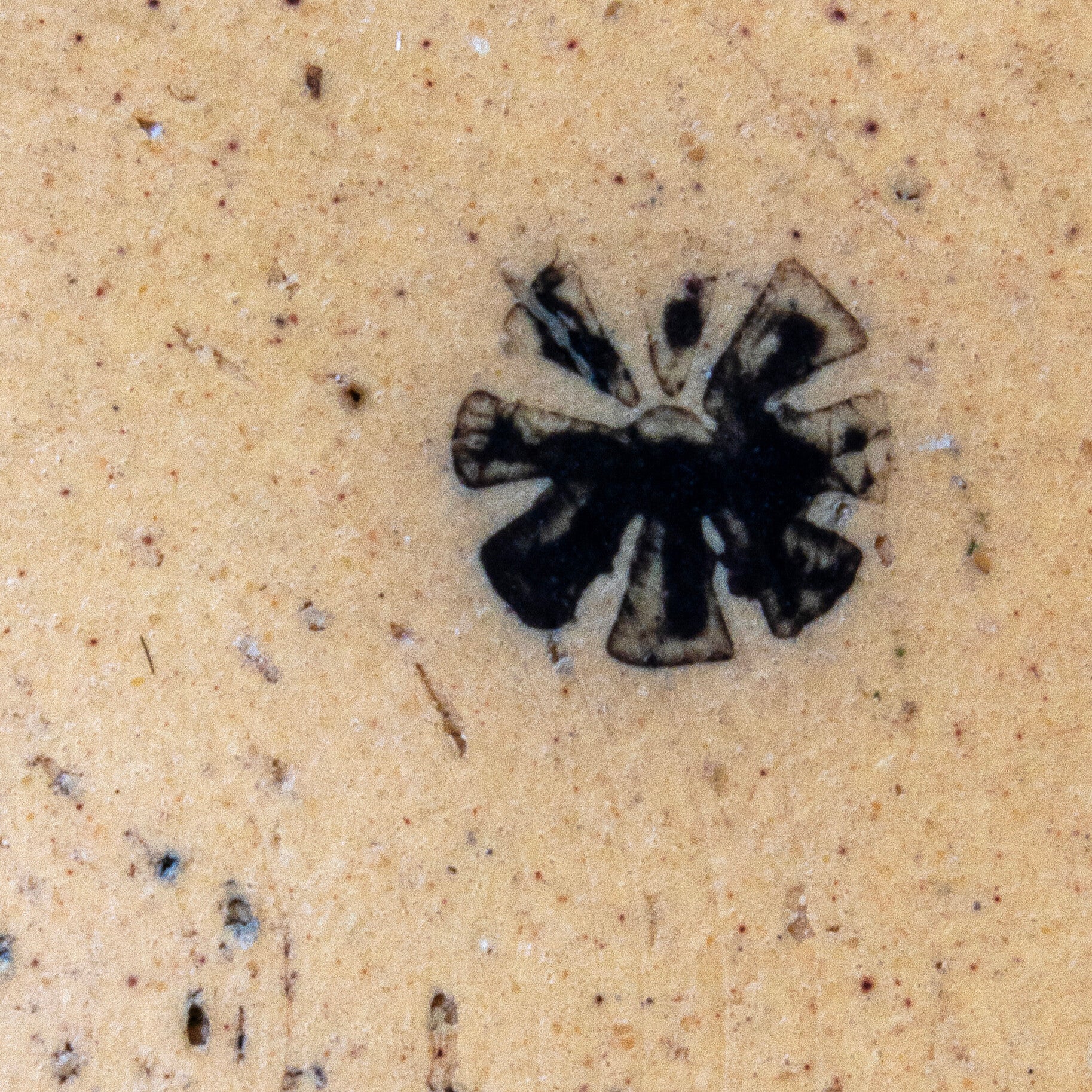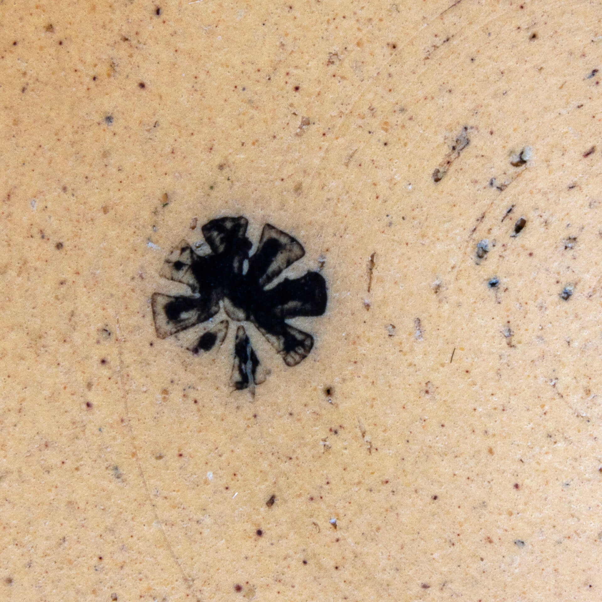 Langley Mill Pottery operated from 1865 to 1982, undergoing a number of name changes. This is a wonderful example of their craft, probably from around the 1930’s but prior to WW2 or the early post-war period. This dating is based on the use of the “windmill” backstamp that can be seen in the last image for this item. While it is smudged the form of the backstamp is discernible and the pa. tent number also assists in identification. The humidor stands 125mm tall to the top of the brass screw (tightened down) and has a maximum diameter of approximately the same measure. The construction materiel is a stoneware style pottery and the brass ‘frog’ is easy to tighten or release. The rubber seal appears intact and capable of giving and airtight seal. The body shape fits with humidors being made pre and post WW2 but in all the years I have had this jar I have failed to find a similar or matching applied pattern.