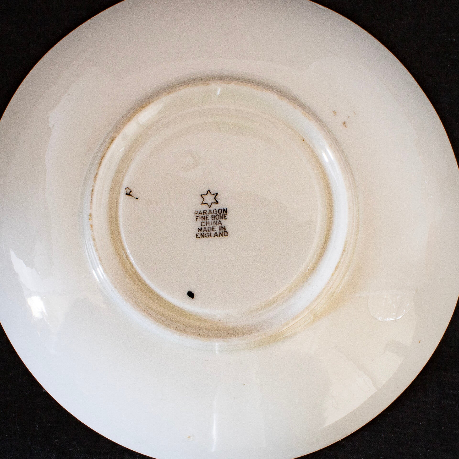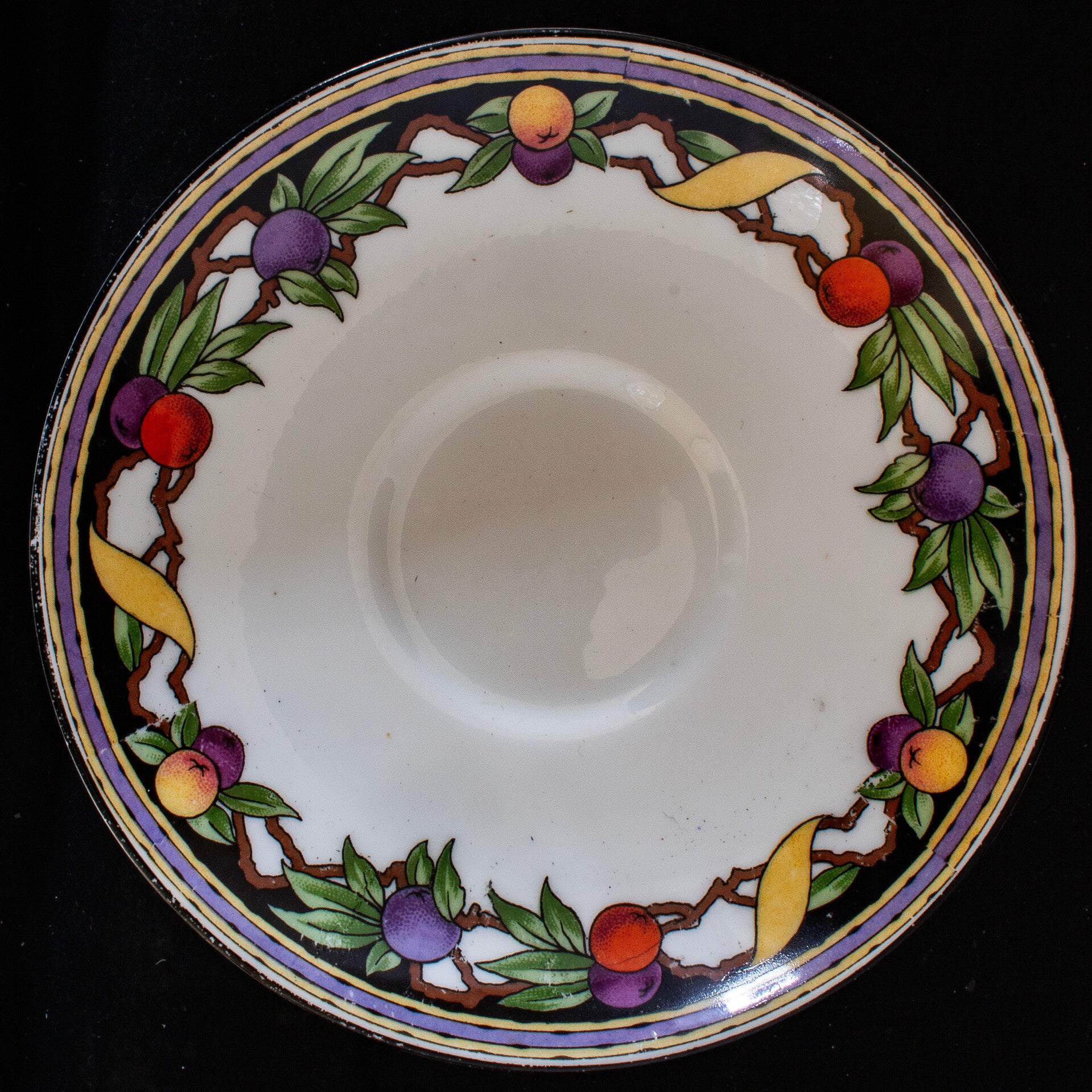 On offer we have a bright and attractive cup and saucer by the Paragon brand which was manufactured in England. This china has a very pretty pattern consisting of multiple coloured fruits, on a black and white background. The fruits are citrus motifs, in colours of red, purple and yellow. These motifs are accented by vibrant yellow ribbon. green leaves and bold dark brown coloured vines/branches. Above this motif is a thin purple stripe that encircles the entire top inner ring of the cup. In addition to this design, the cup also has some black accents on its handle, and one continuous thin black line that encircles the outside of the cup. The saucer has this exact same design trim as the cup, located on the inner rim and surface of the saucer. There is a backstamp on both the cup and saucer: ‘Paragon, Fine Bone China, Made In England’ There is also the Star logo above the words Paragon. The pattern number is given as 1451. The backstamp dates the set to c.1923-33. The cup and saucer are in excellent vintage condition. The set does not have any chips, cracks or crazing. Cup Diameter: 3 5/8 inches - 92mm; height: 2 inches - 50.5mm saucer Diameter: 5 1/2 inches – 140mm